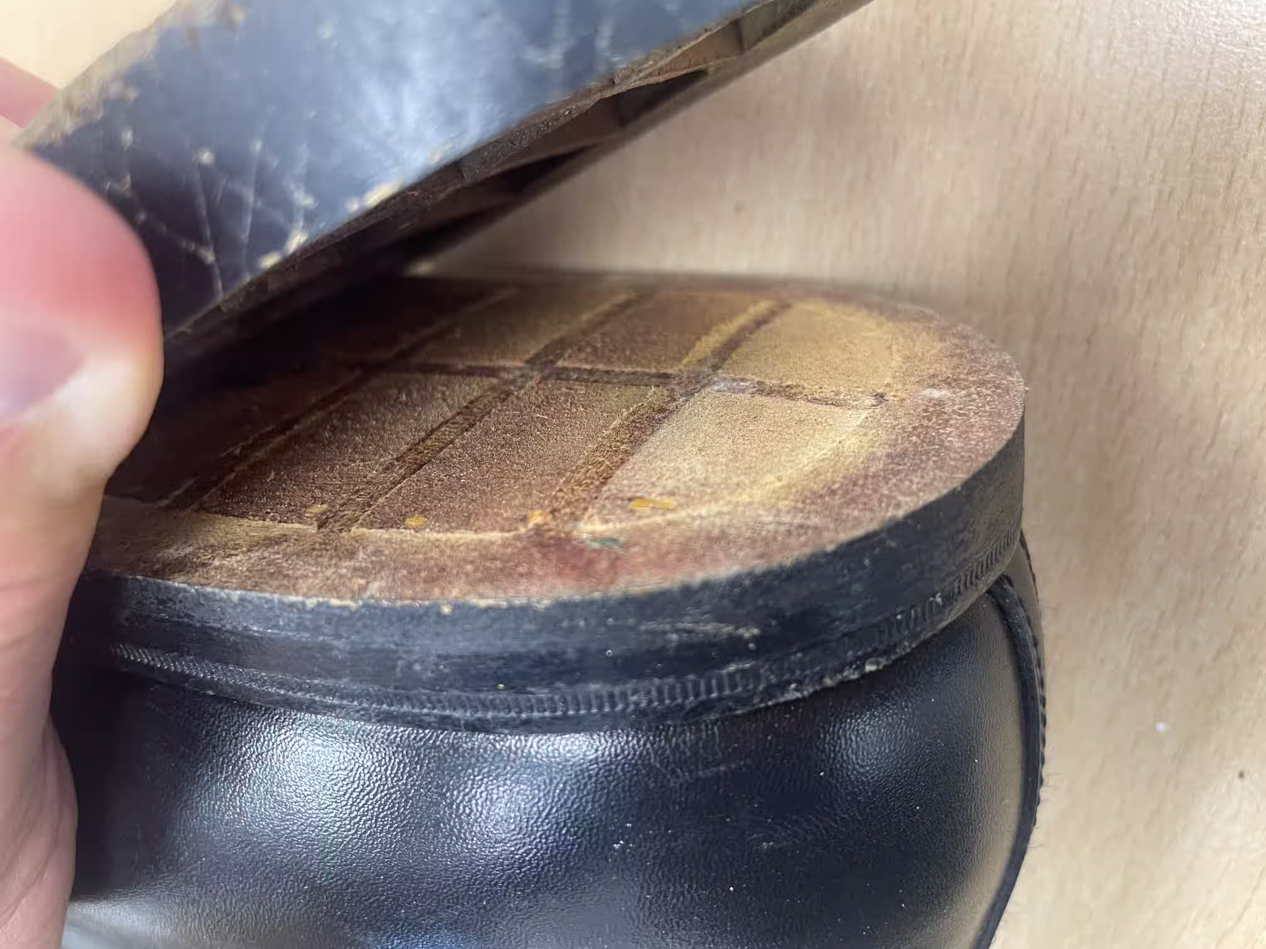 As a final counterexample, I mention shoes in the Blake construction that do not have a thin rubber sole and still have no visible seam on the bottom surface of the outsole. This can be because the Blake stitch is hidden in the leather of the outsole and only becomes visible over time as the shoe is worn, when more sole leather is worn away. There are techniques for cutting open the sole leather and closing it again after the Blake stitch has been applied.