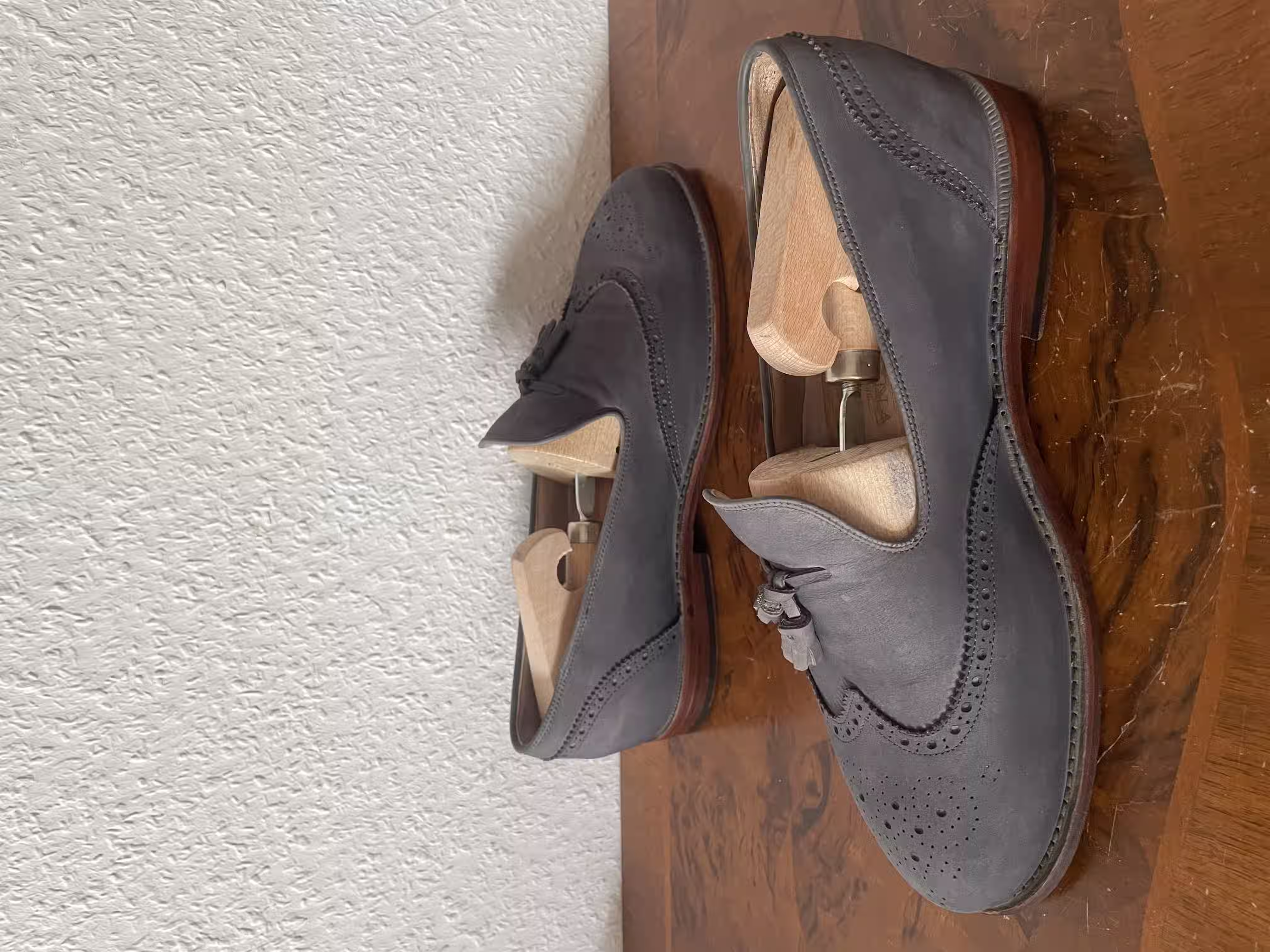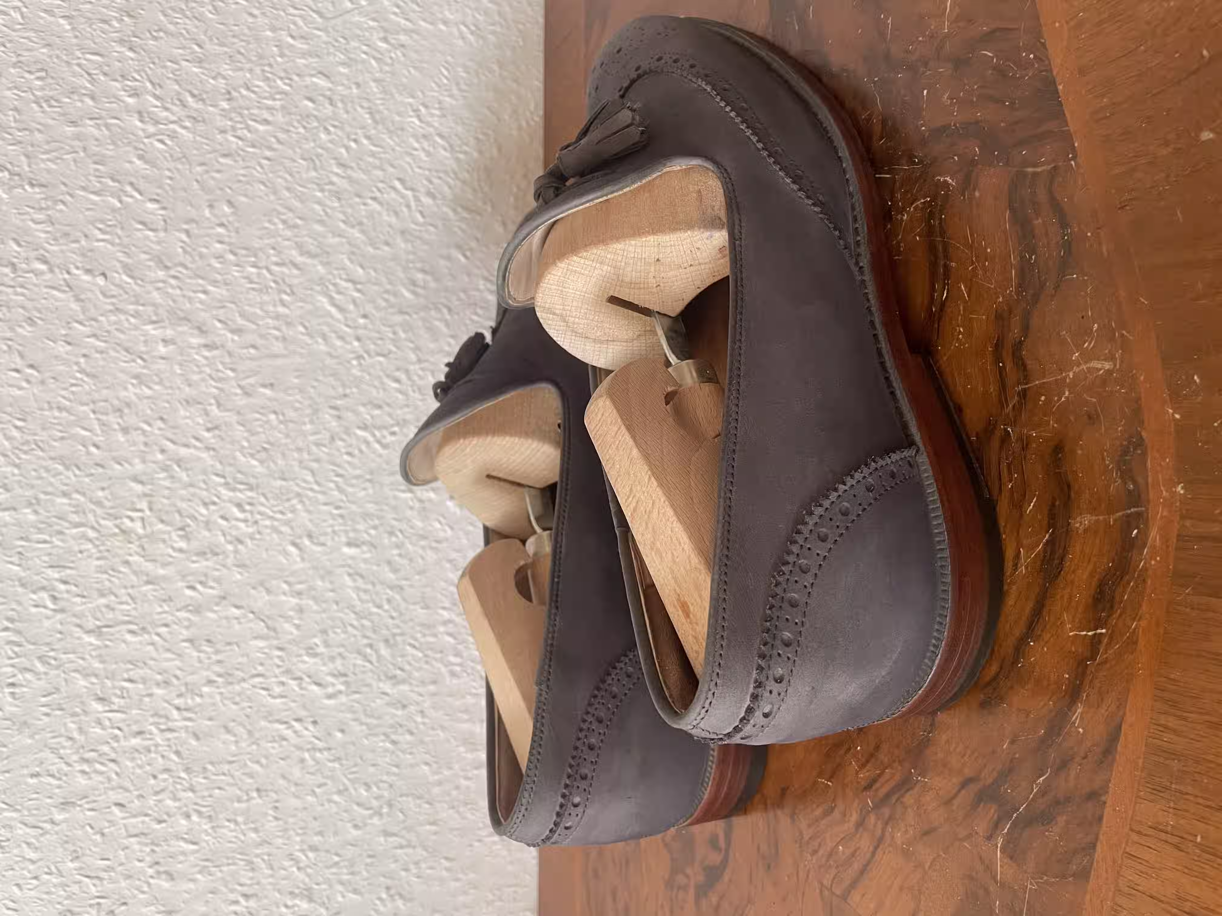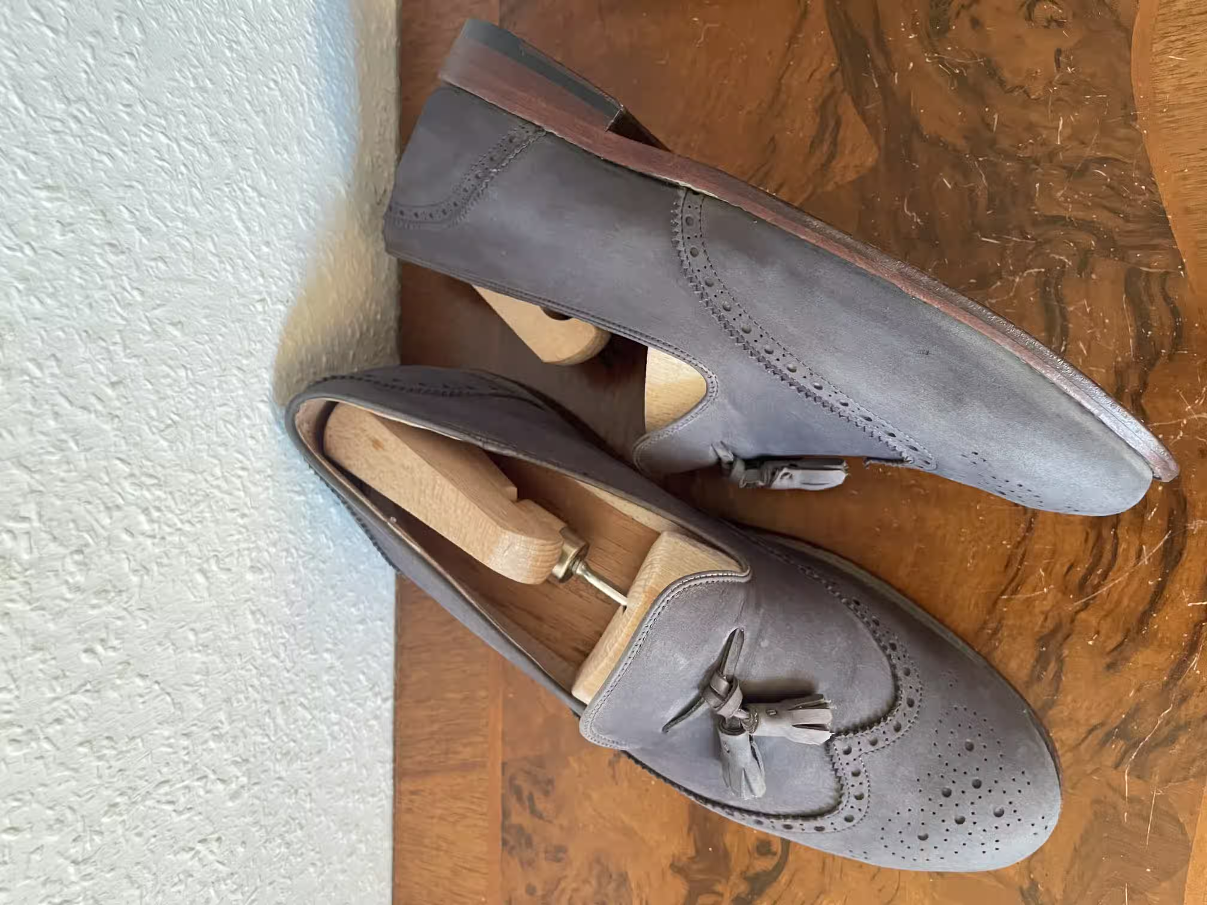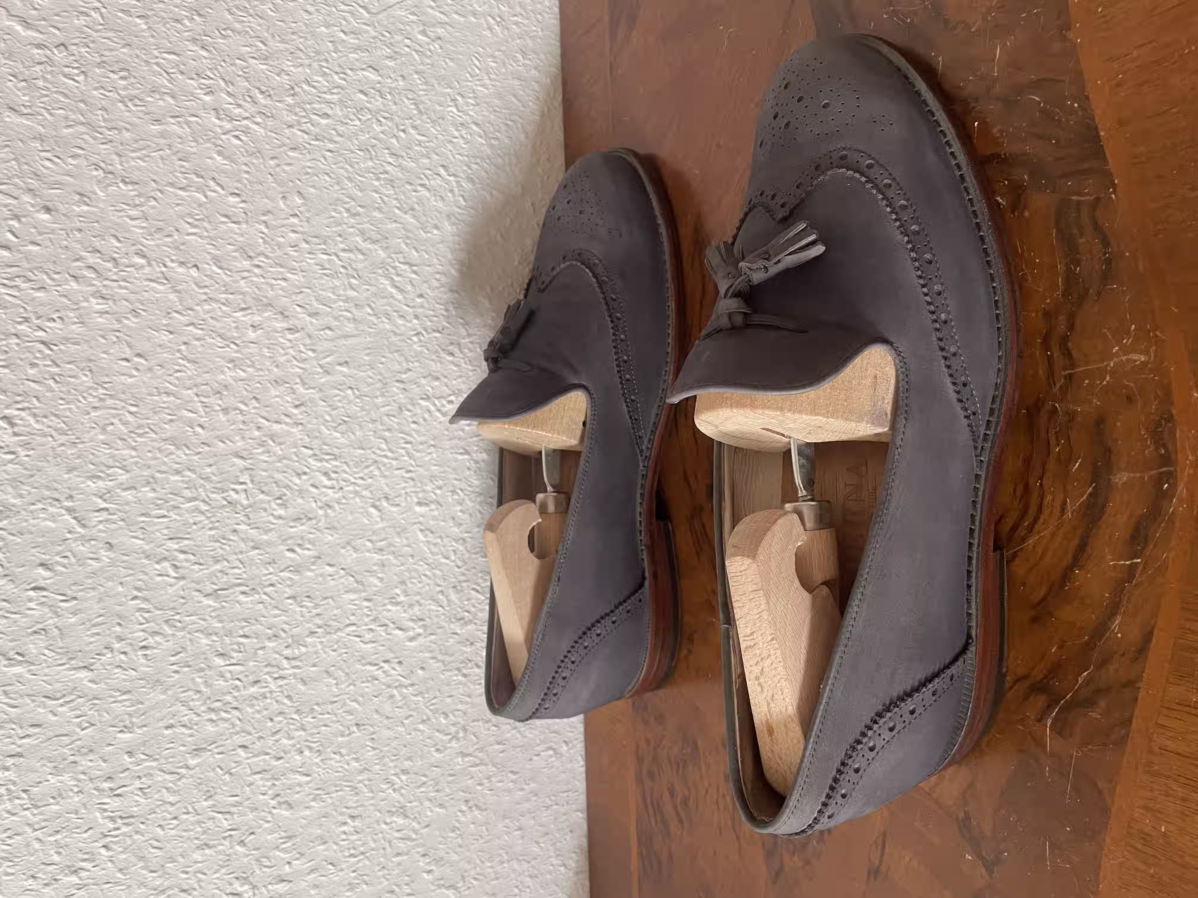 Gray tassel loafers made of nubuck leather and in Blake-Rapid construction
