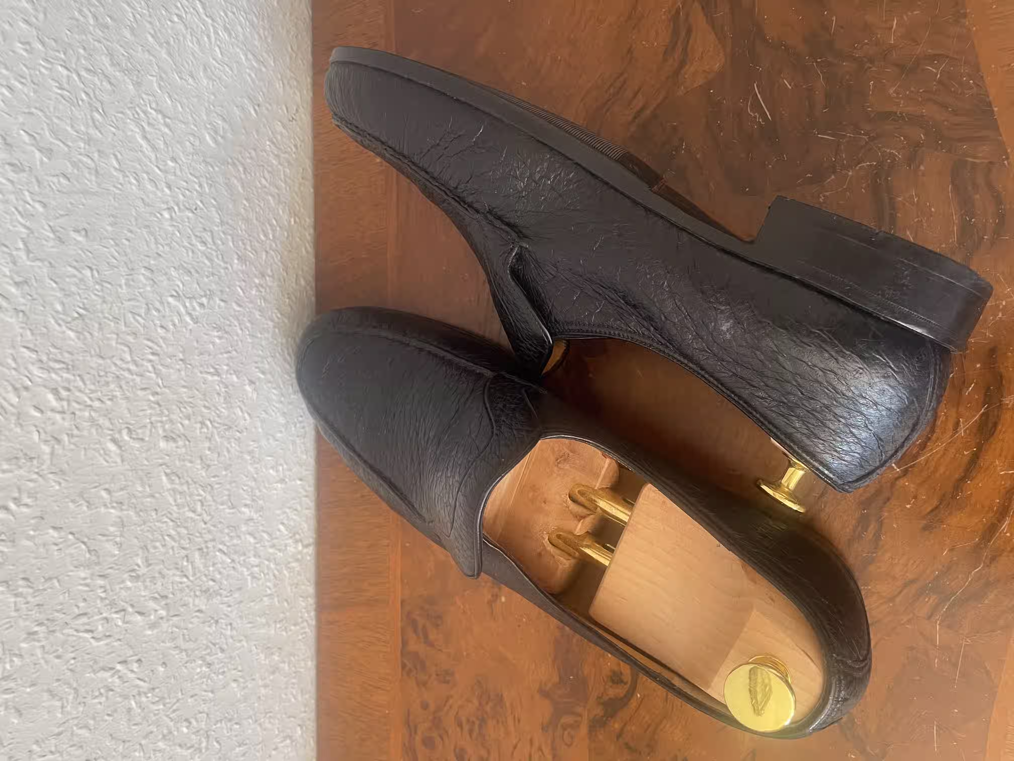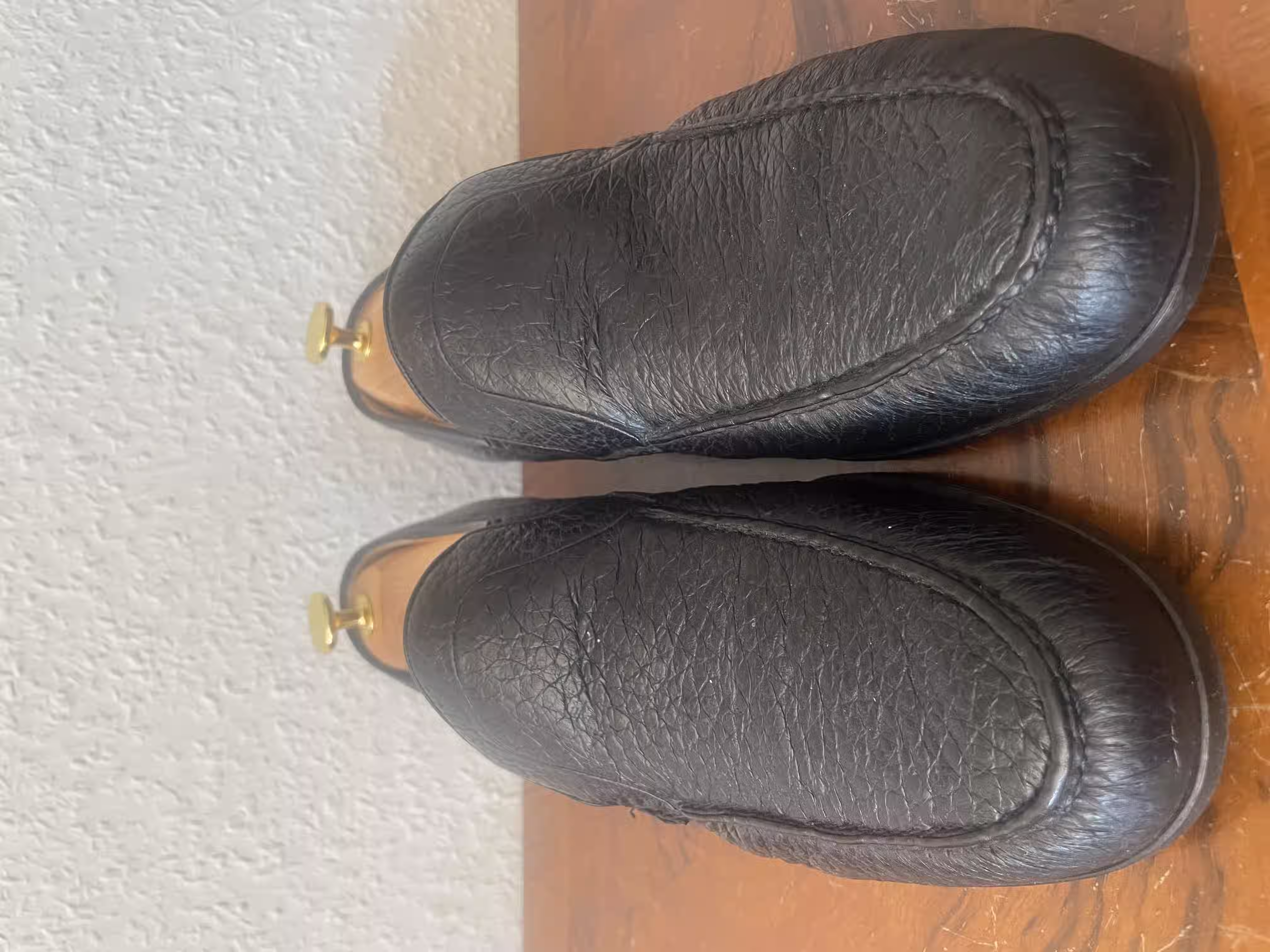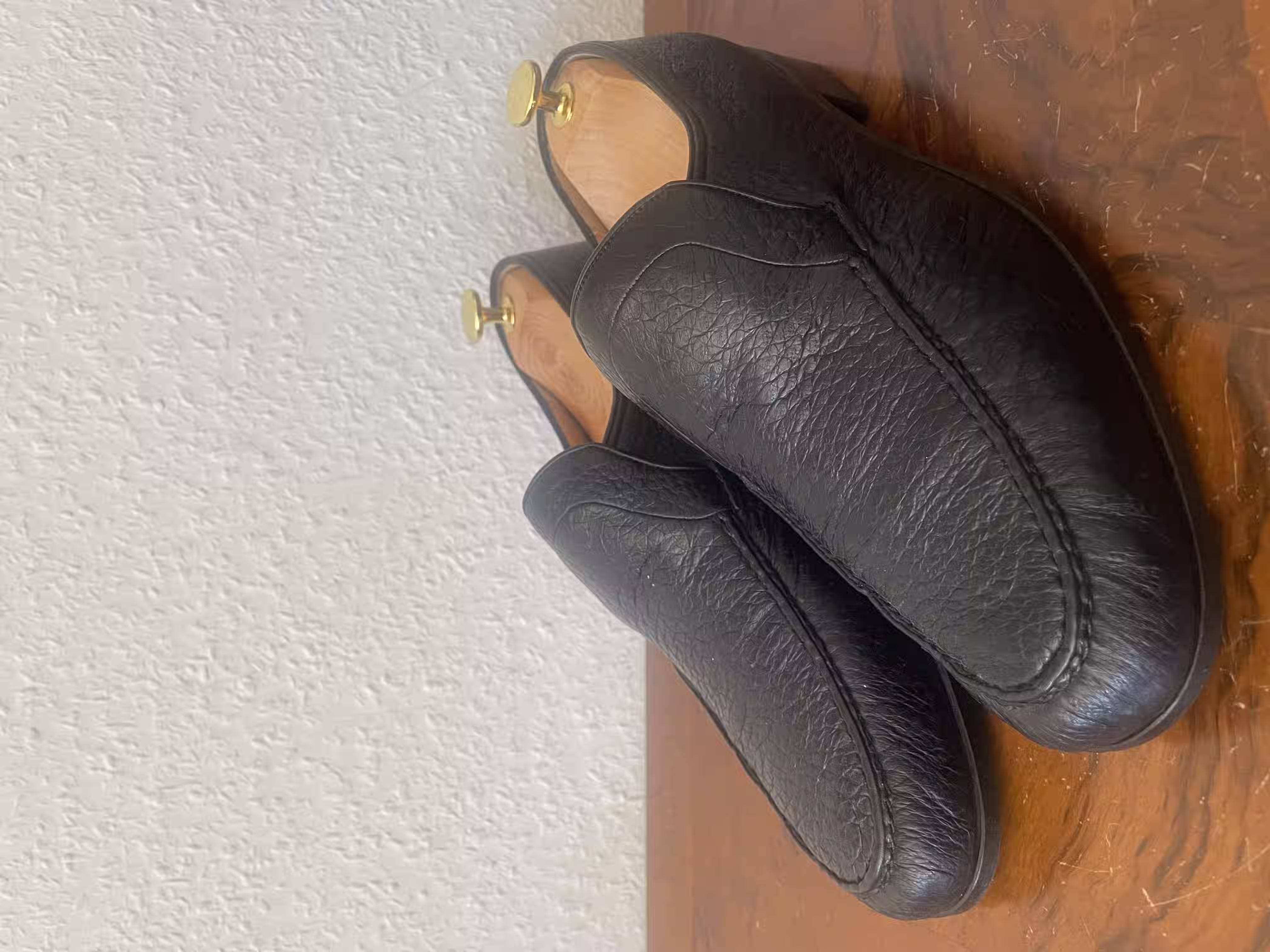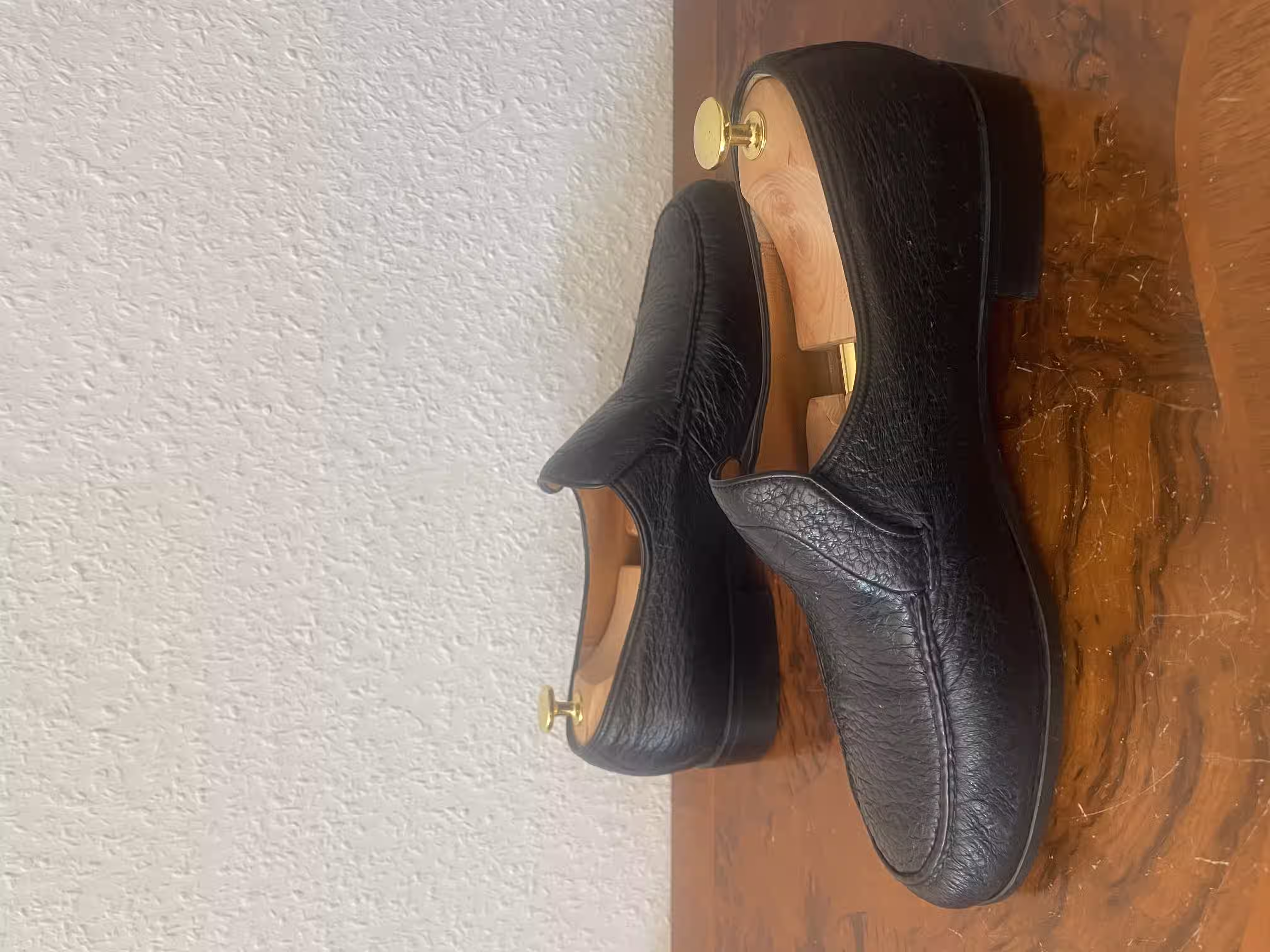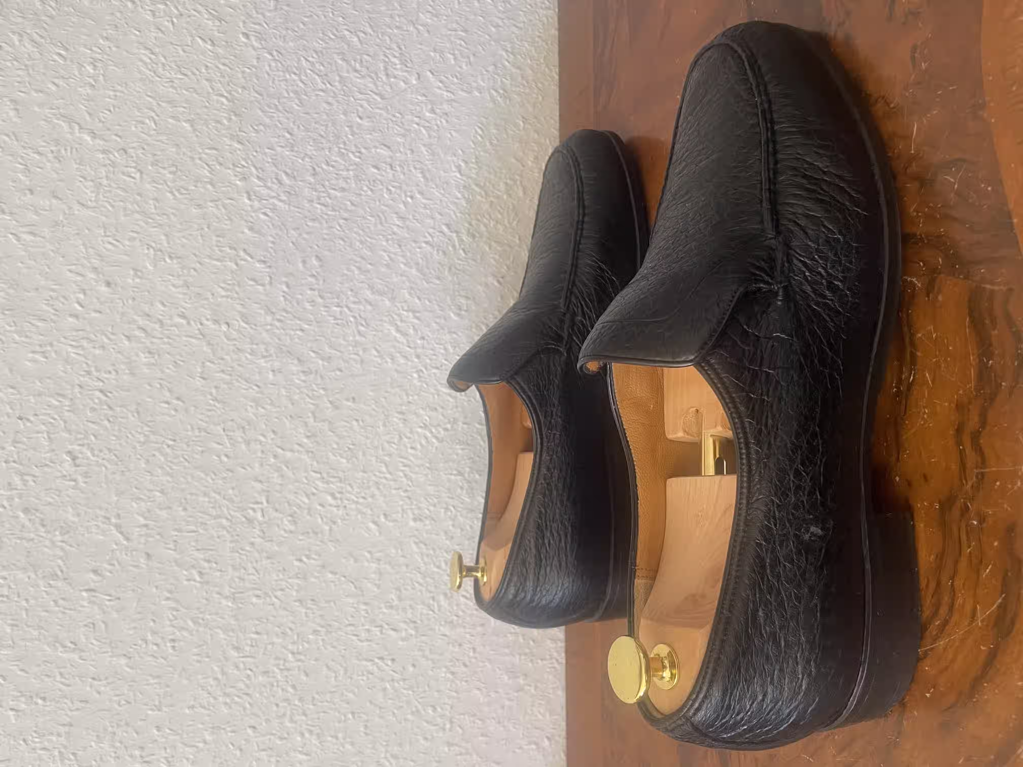 Here is a pair of summery loafers in the not-so-summery color black. This is a special use case of the simple Blake construction, whose Blake stitch you can see inside the shoe. However, you can’t see anything on the outsole here because the Blake stitch is hidden inside the leather there, and in addition a flat, covering rubber sole is attached.