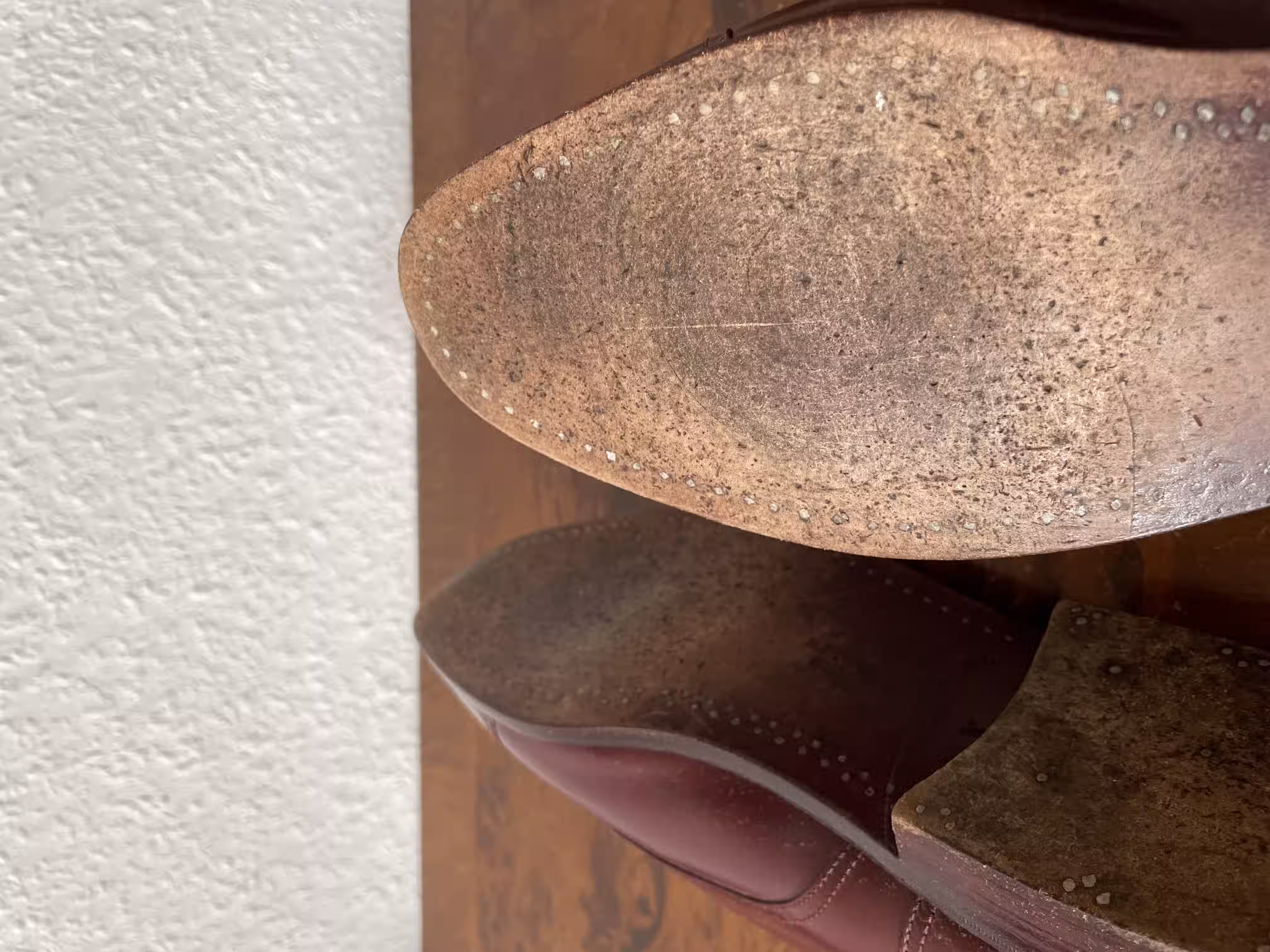 You can normally recognize a wooden-nailed construction from the outside by the wooden nails that are embedded in the soles and can be seen on the surface of the outsole. Because the wooden nails stand out in color from the leather of the outsole, you can recognize dotted patterns on the outsole, always quite close to the edge of the sole.
