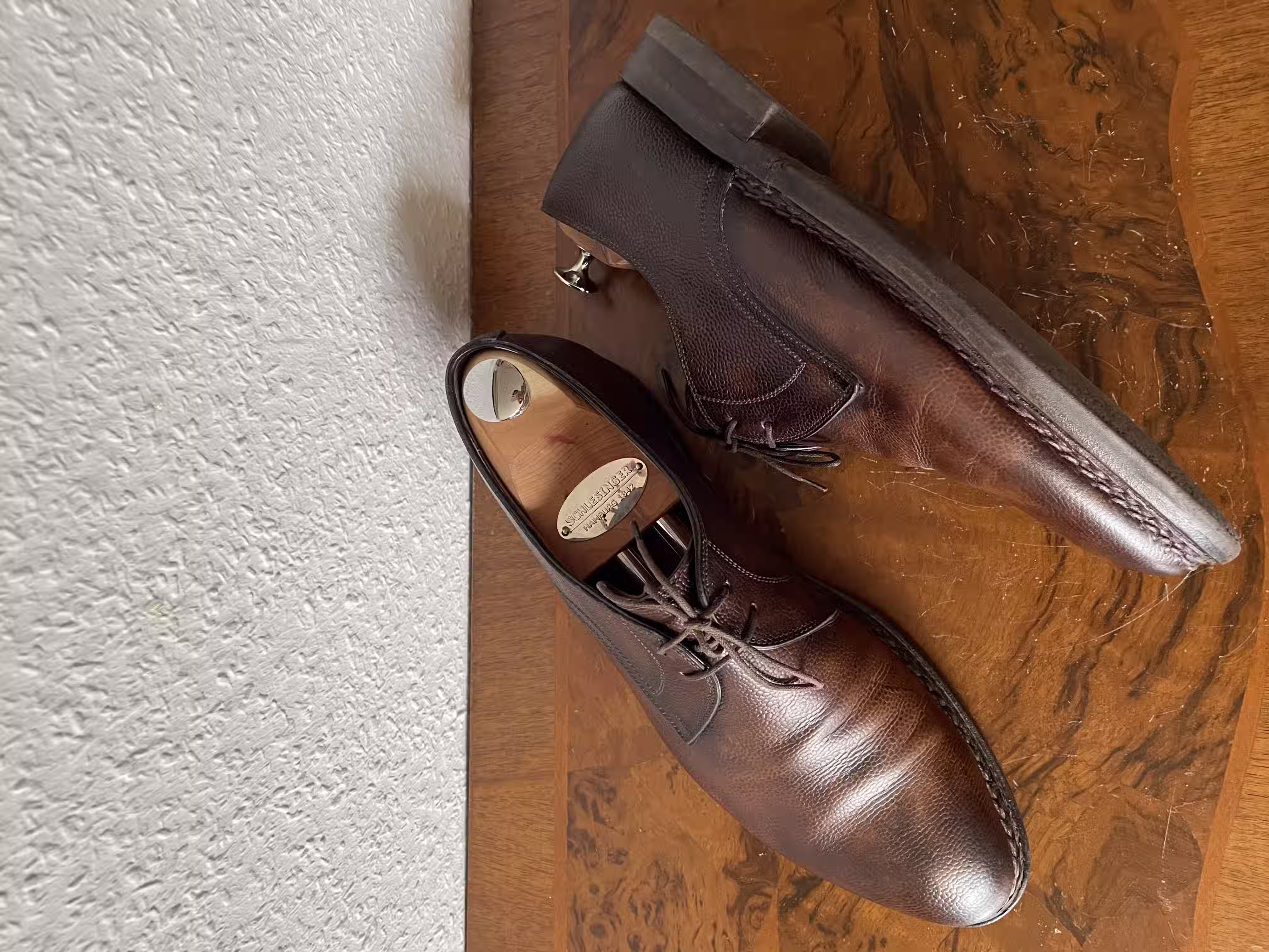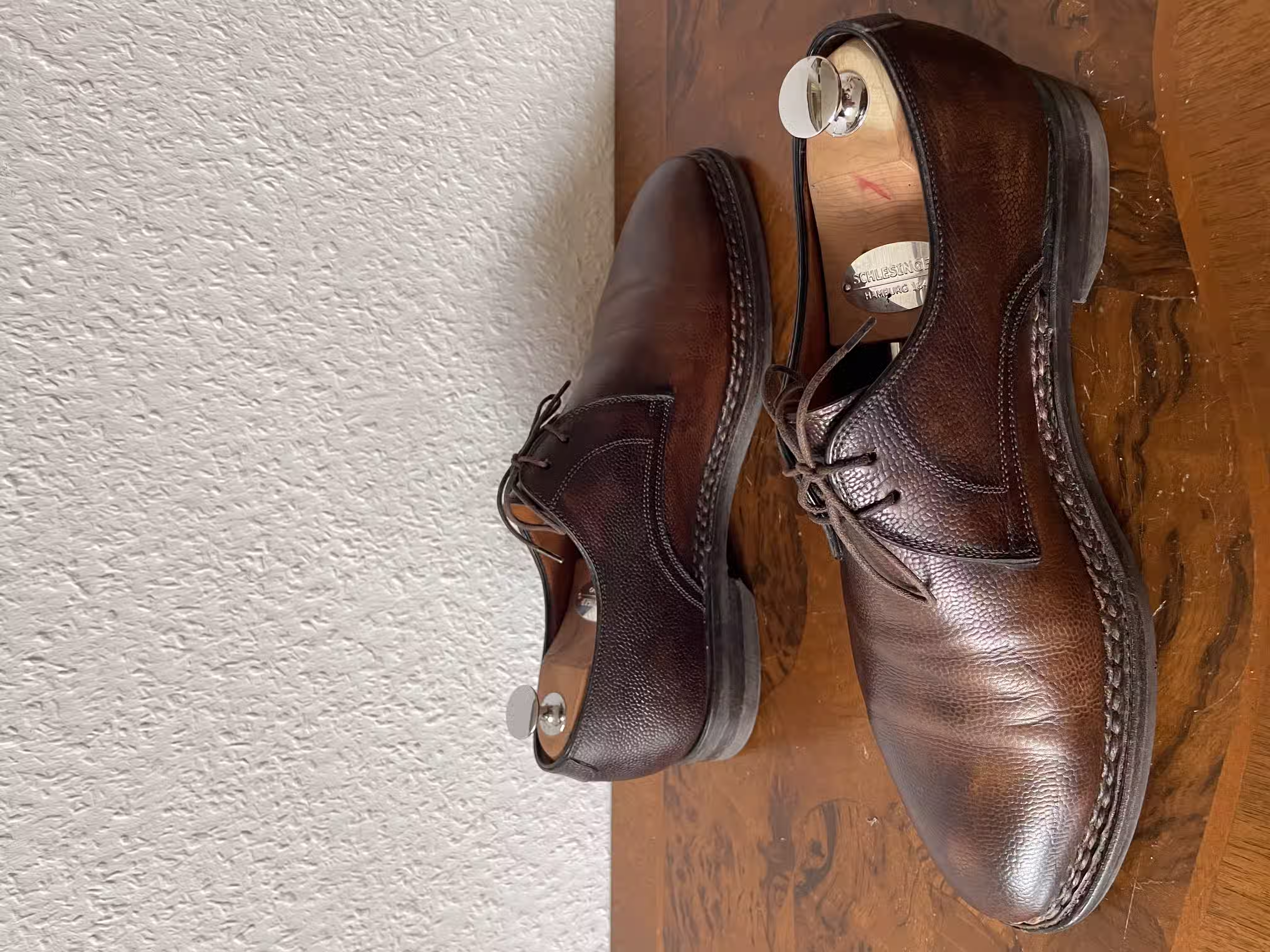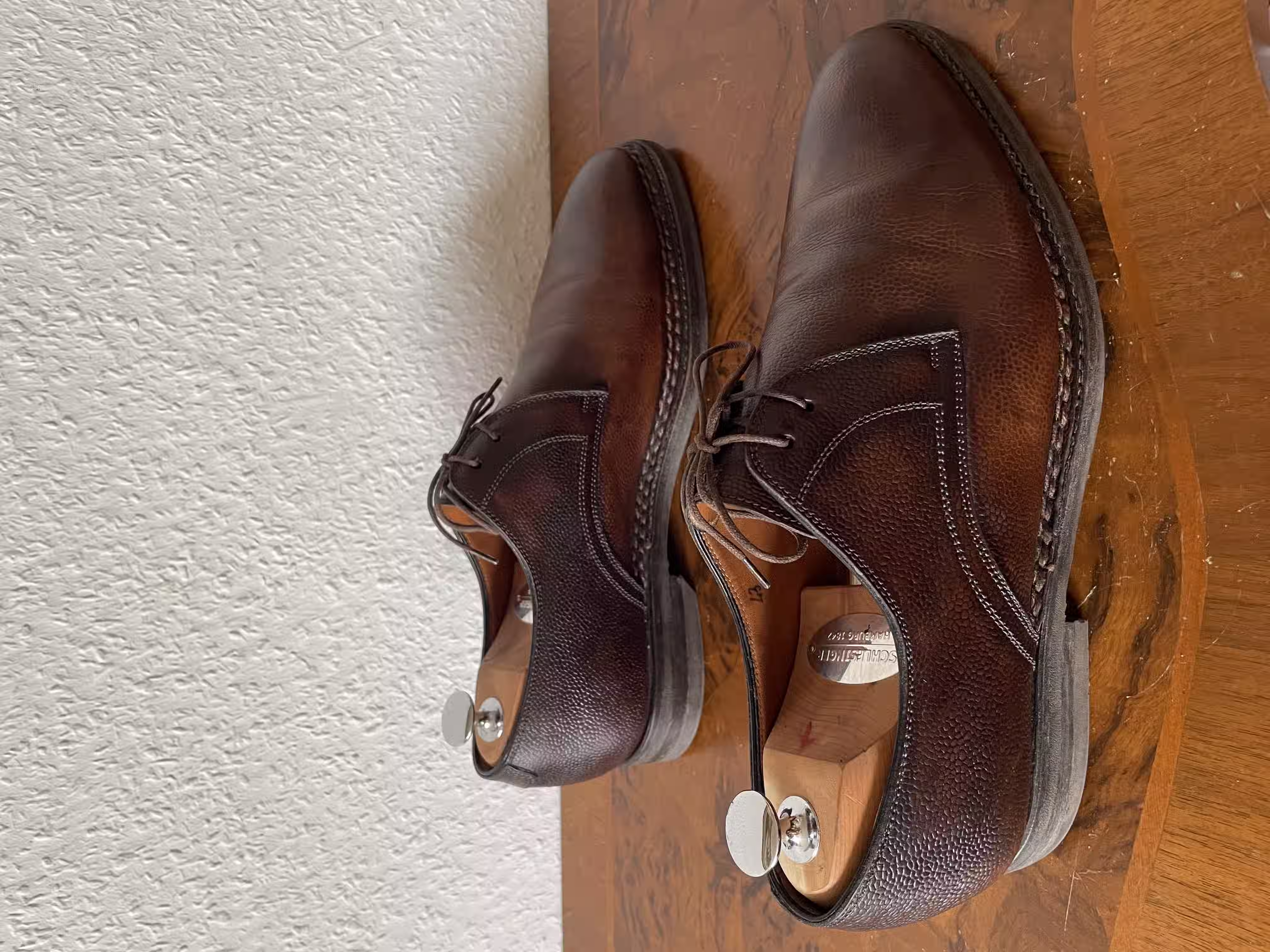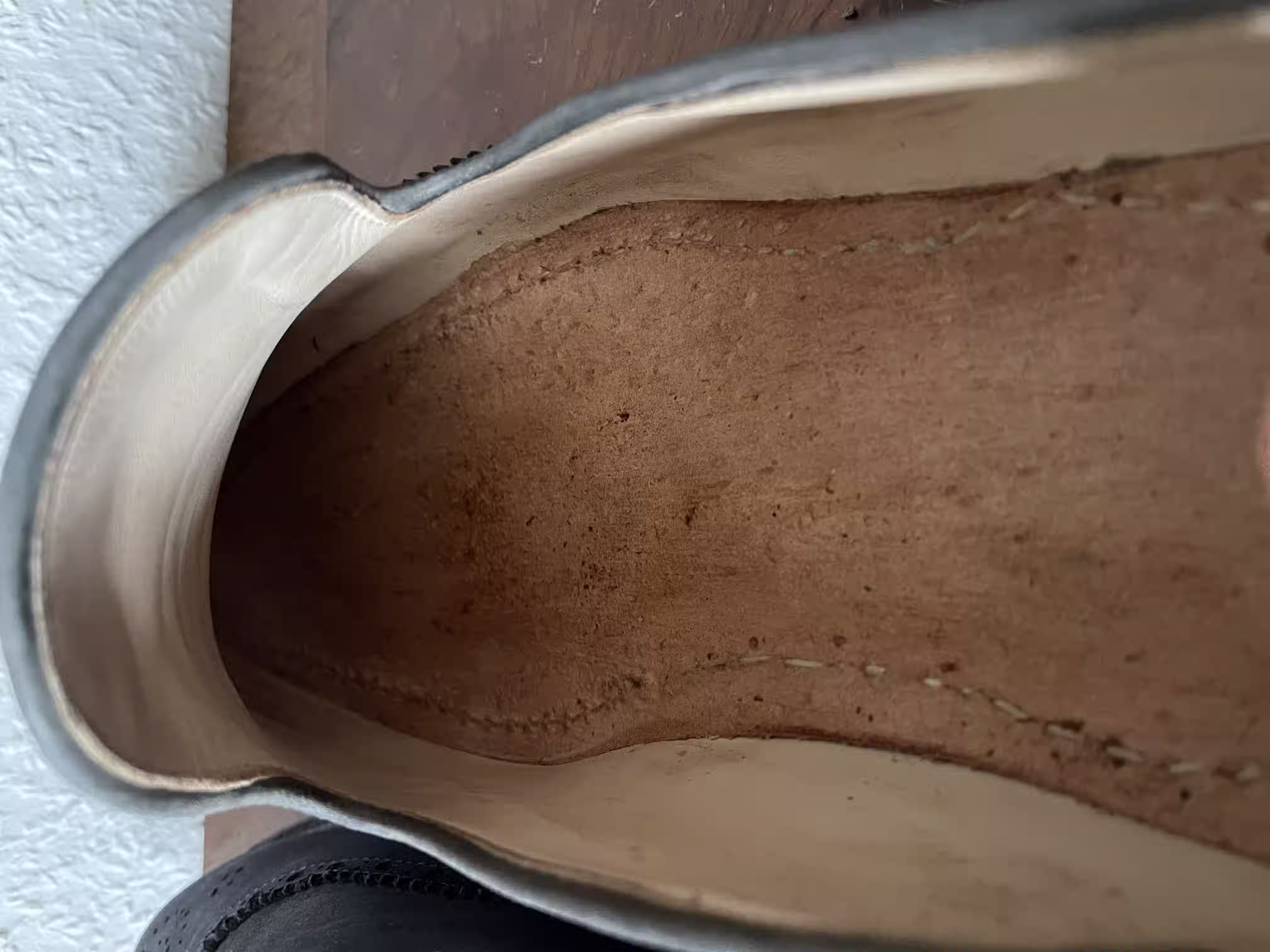 I once had a pair of nice black single monks; from the outside they looked very good and were quite comfortable. I had the impression that they were stitched in the traditional craft manner and was very happy with them - until the upper started to come loose from the entire sole. Perhaps there are also craftspeople who make the work particularly easy and comfortable for themselves by foregoing sewing in favor of faster glue. Or there are simply very well-made shoes of glued construction. Still, I prefer sewn shoes here, because something like this wouldn’t have happened to me with sewn shoes. But it’s not a disaster, and a cobbler can quickly glue the shoe parts back together.
