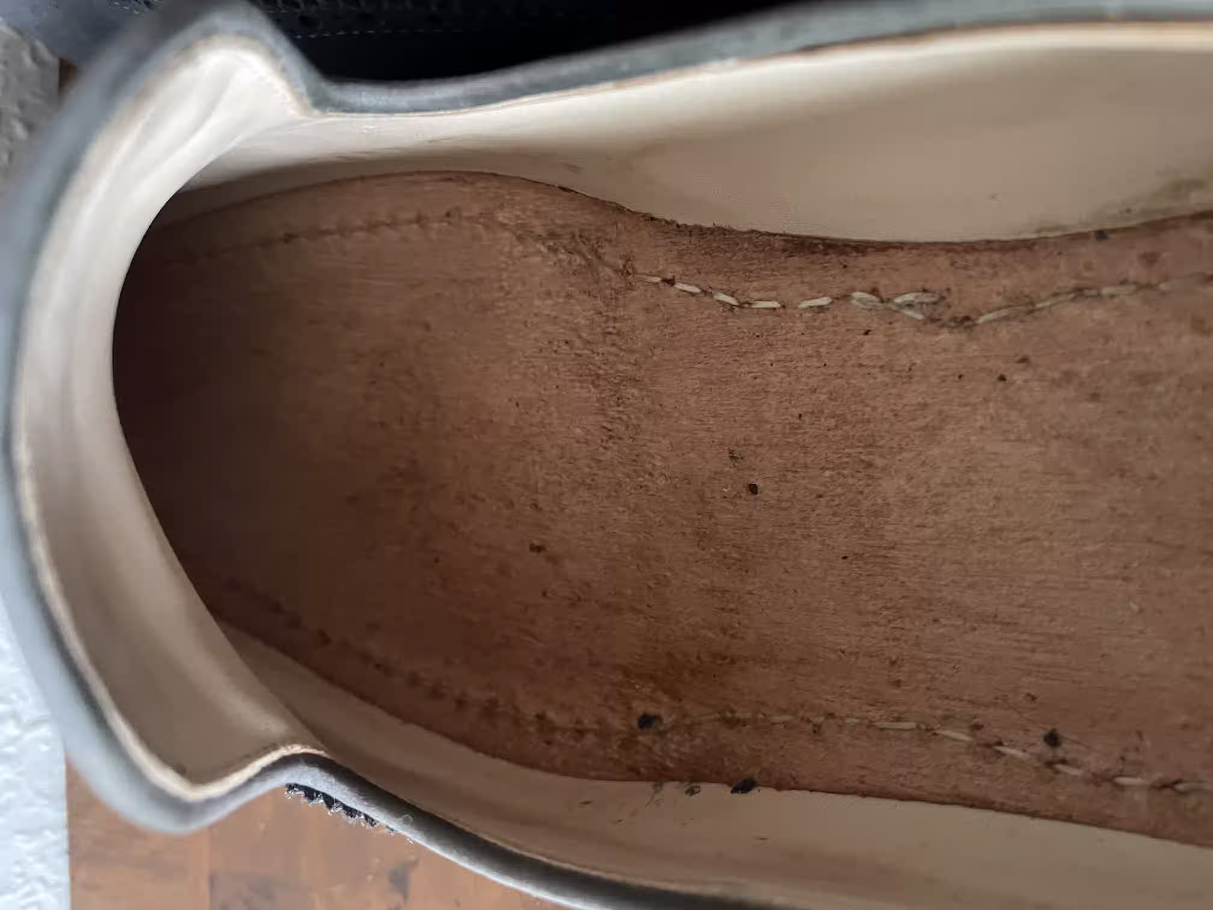If, however, you can’t see any seams there and optionally even see dotted patterns on the insole inside the shoe, then the shoe is very likely wooden-nailed.