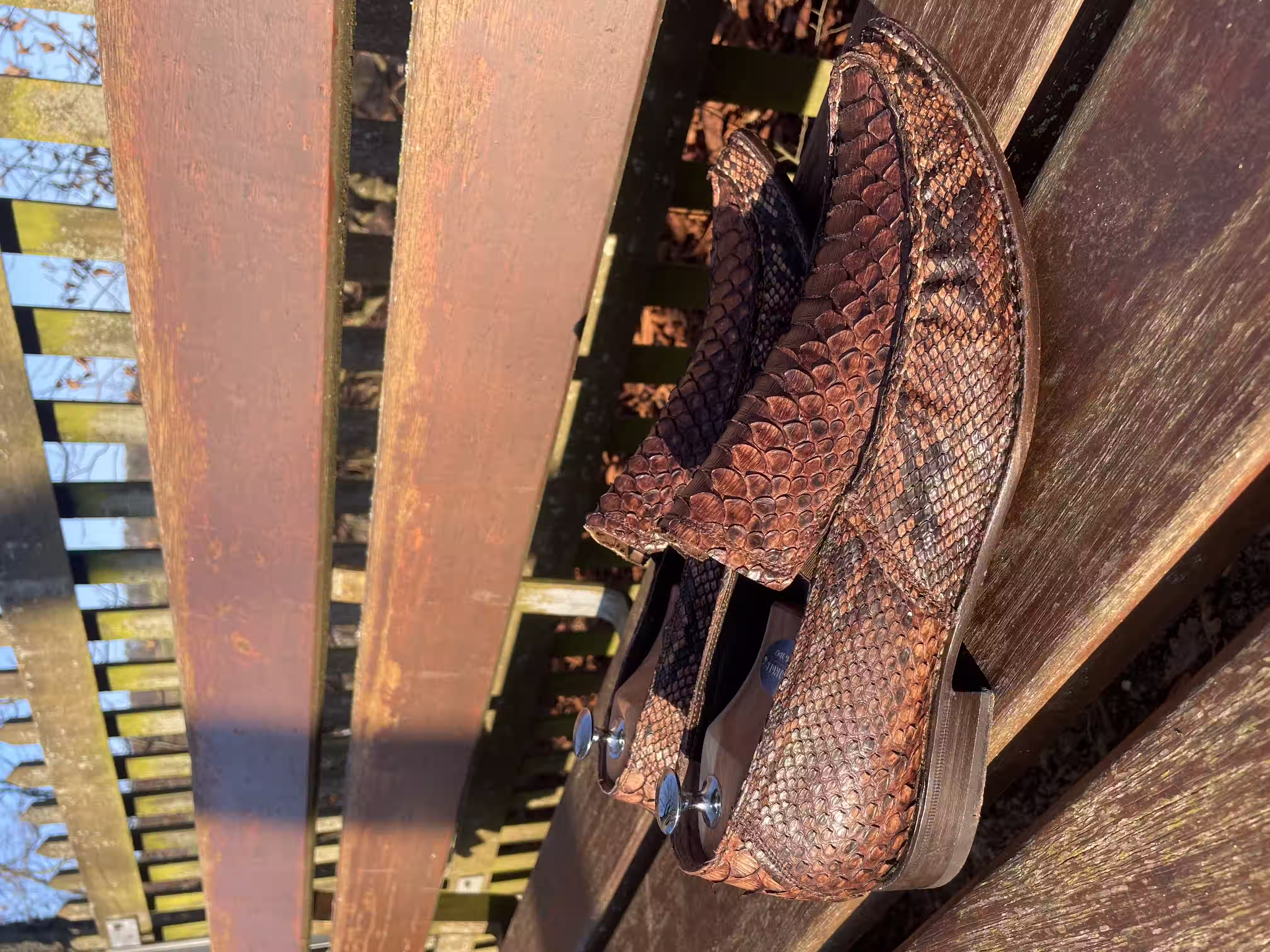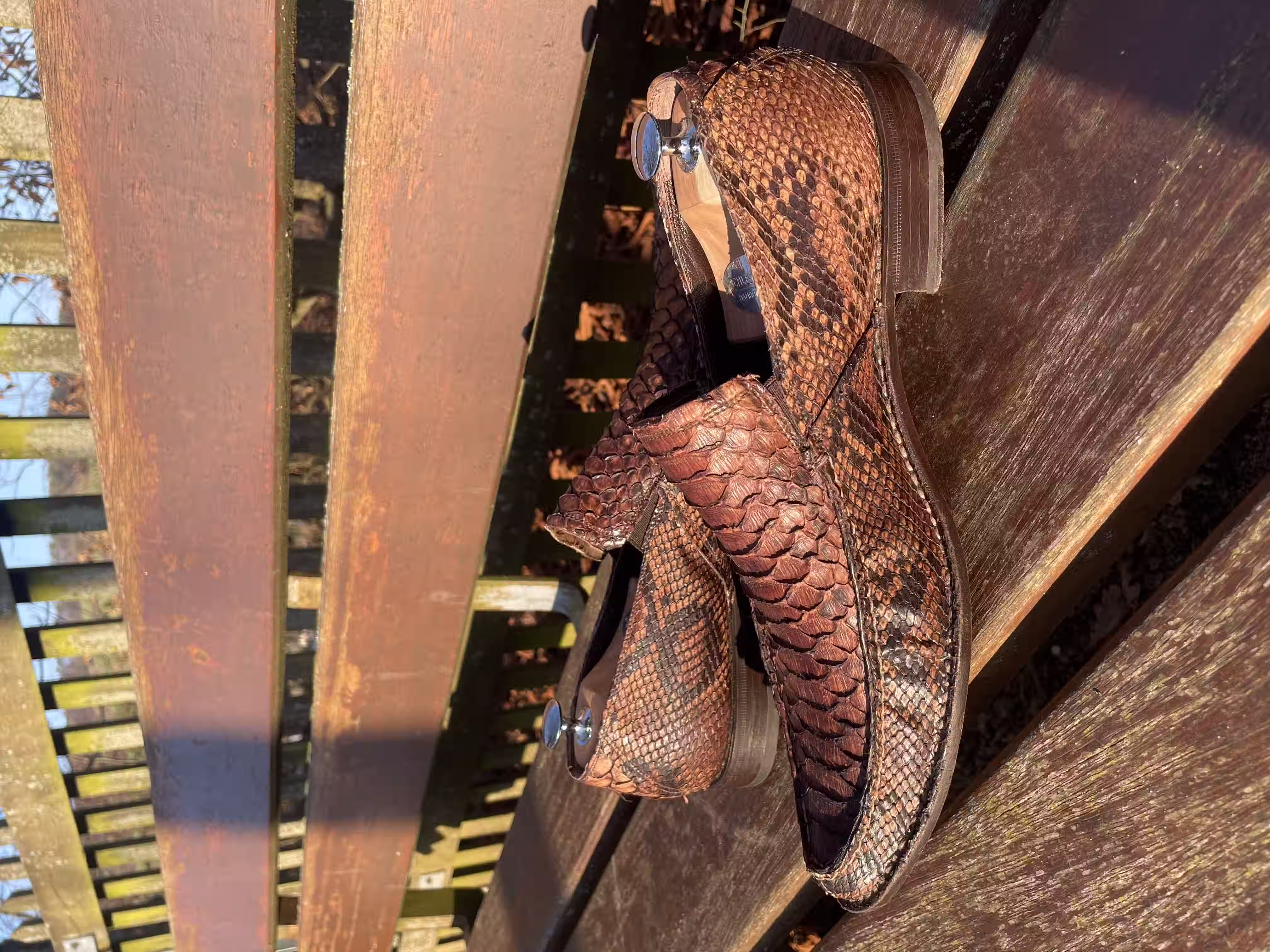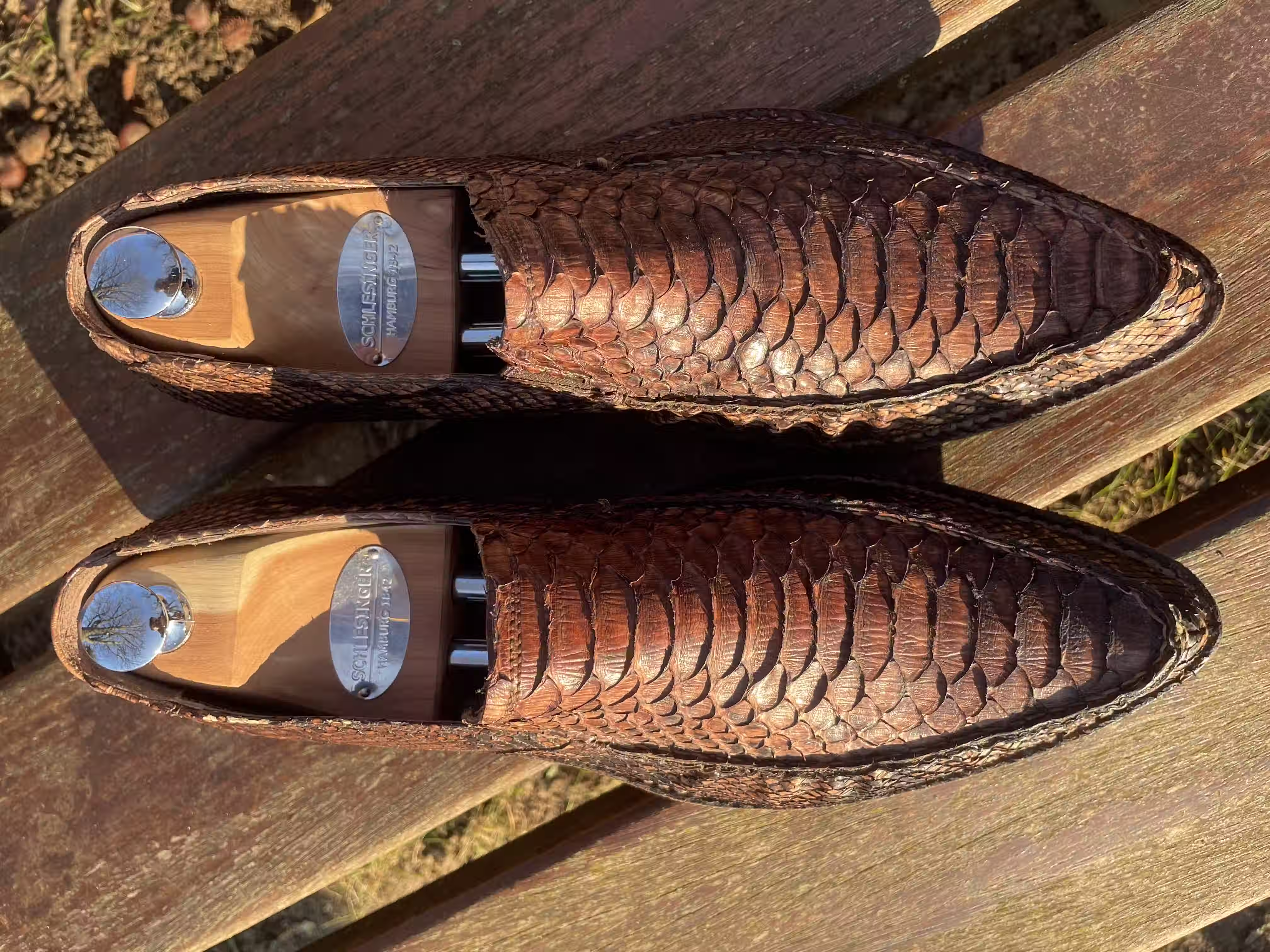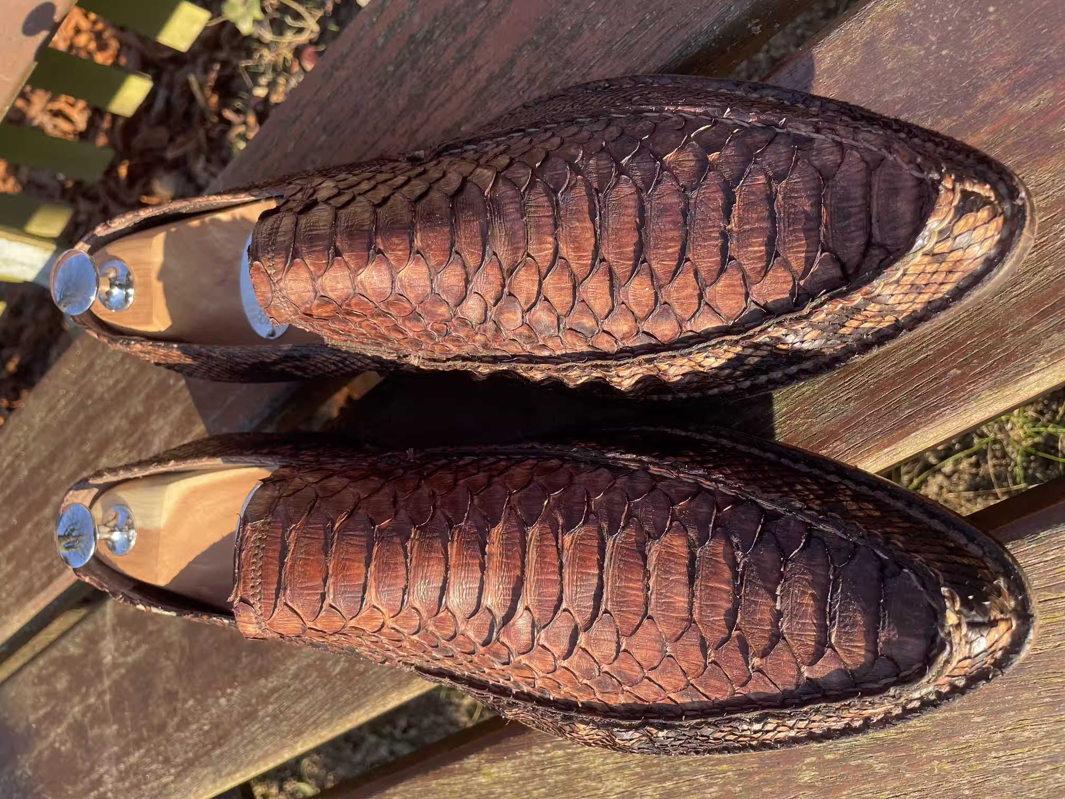 These are very casual loafers with an unusual toe shape and made of snakeskin, whose scales stand out slightly upon closer inspection. It is a pure leisure shoe that, in my opinion, can be well combined with jeans or chinos. Personally, I would only wear such loafers in summer - in my view, snakeskin fits best there because it has a touch of the exotic.