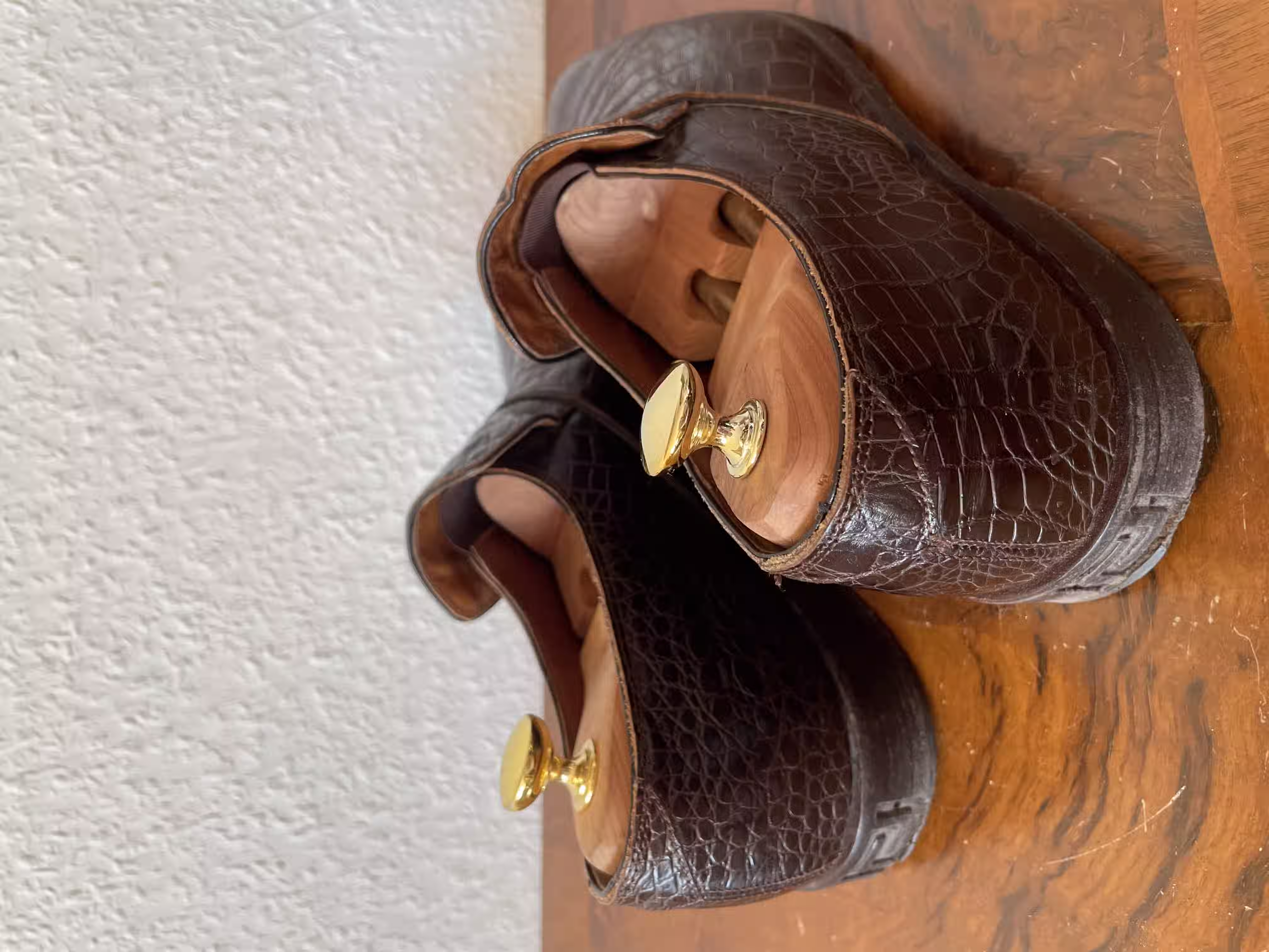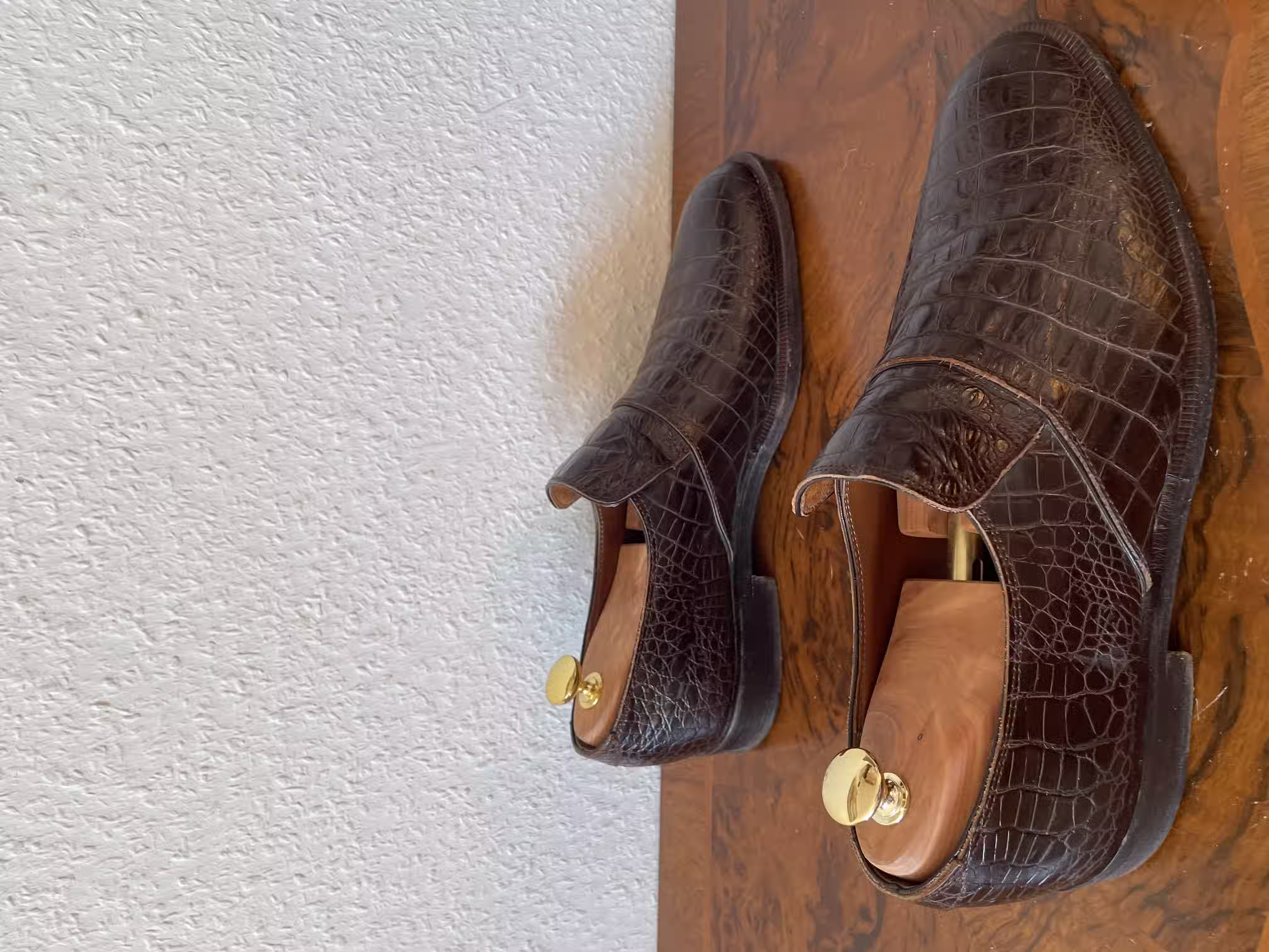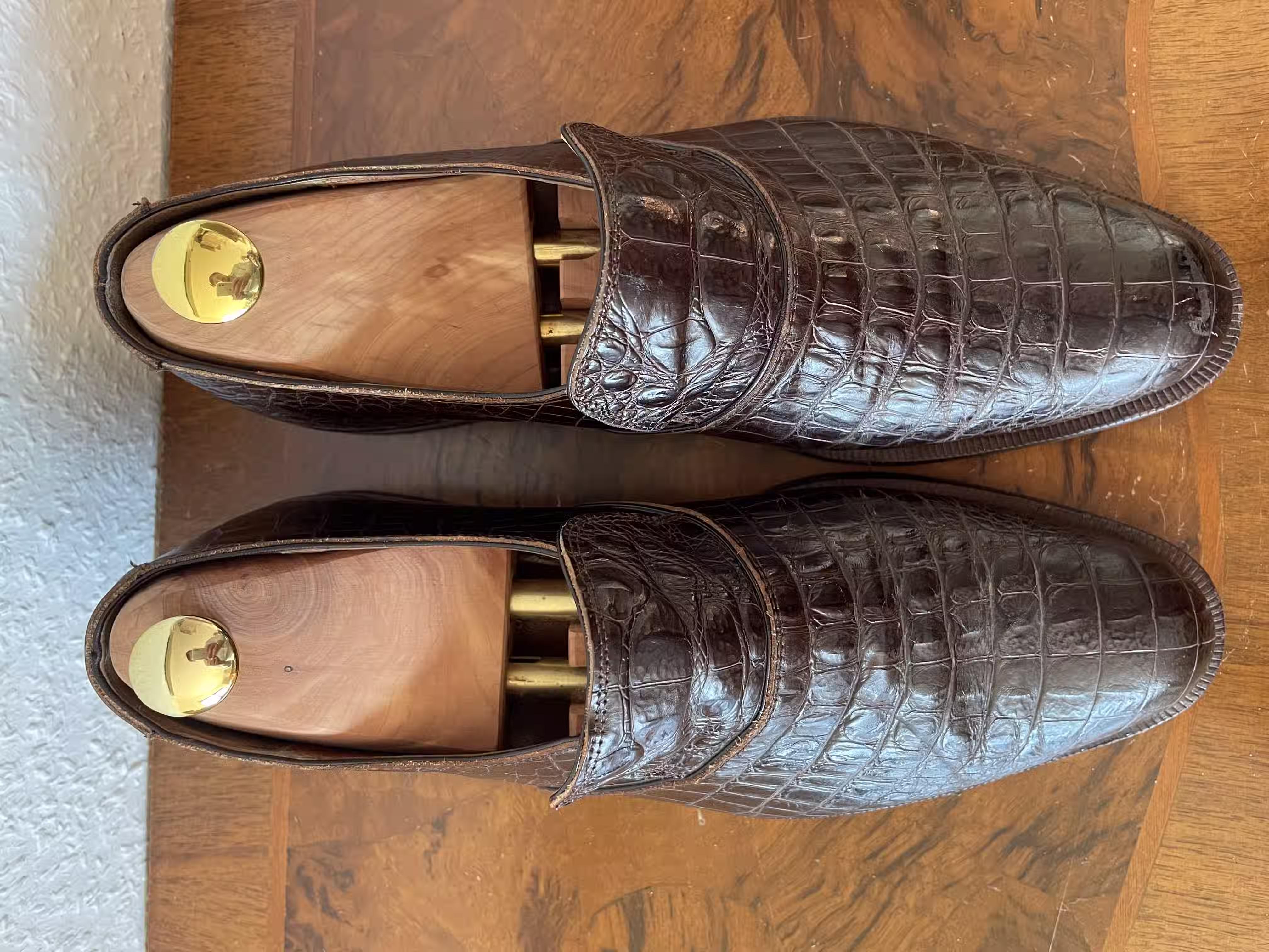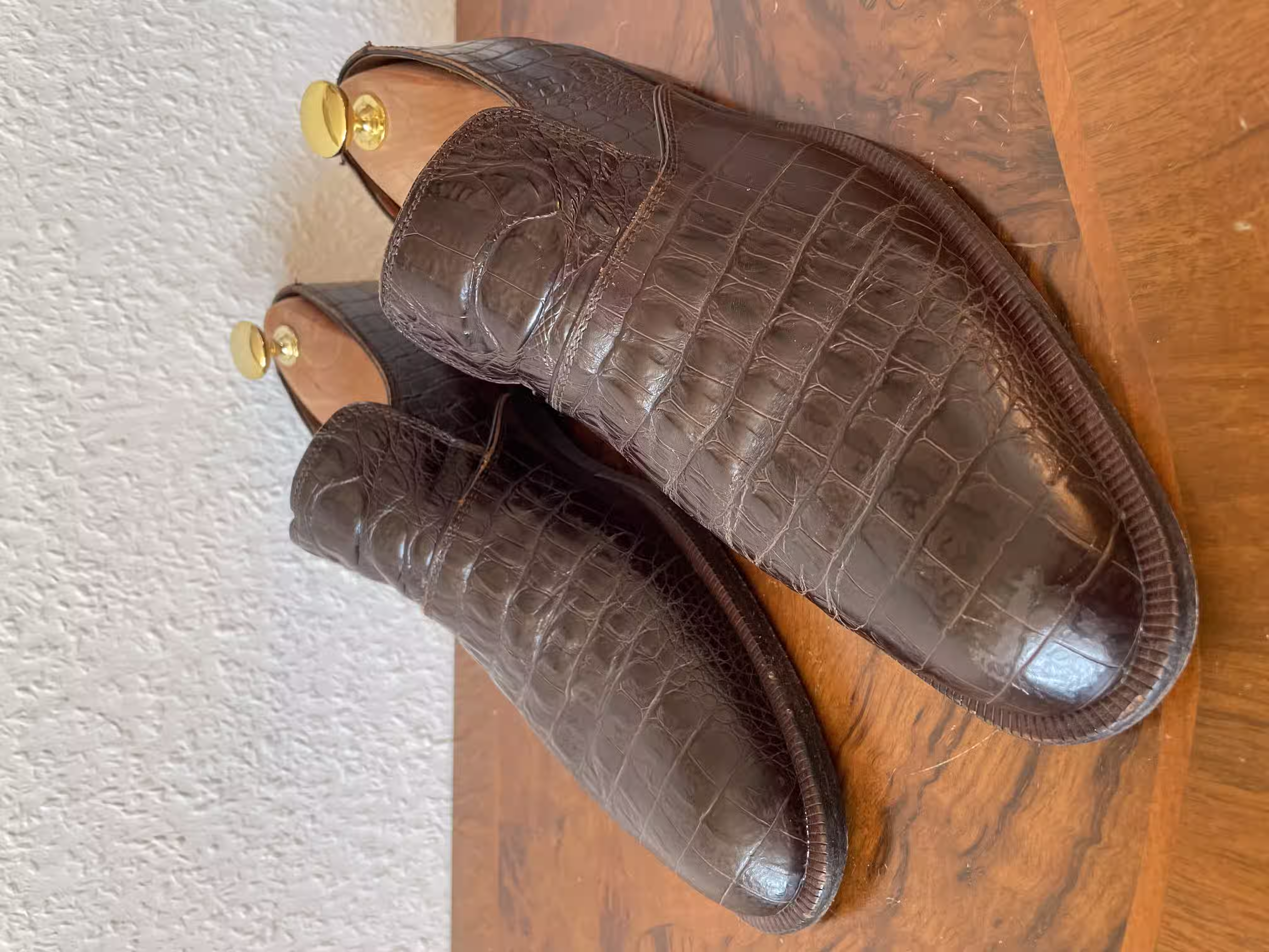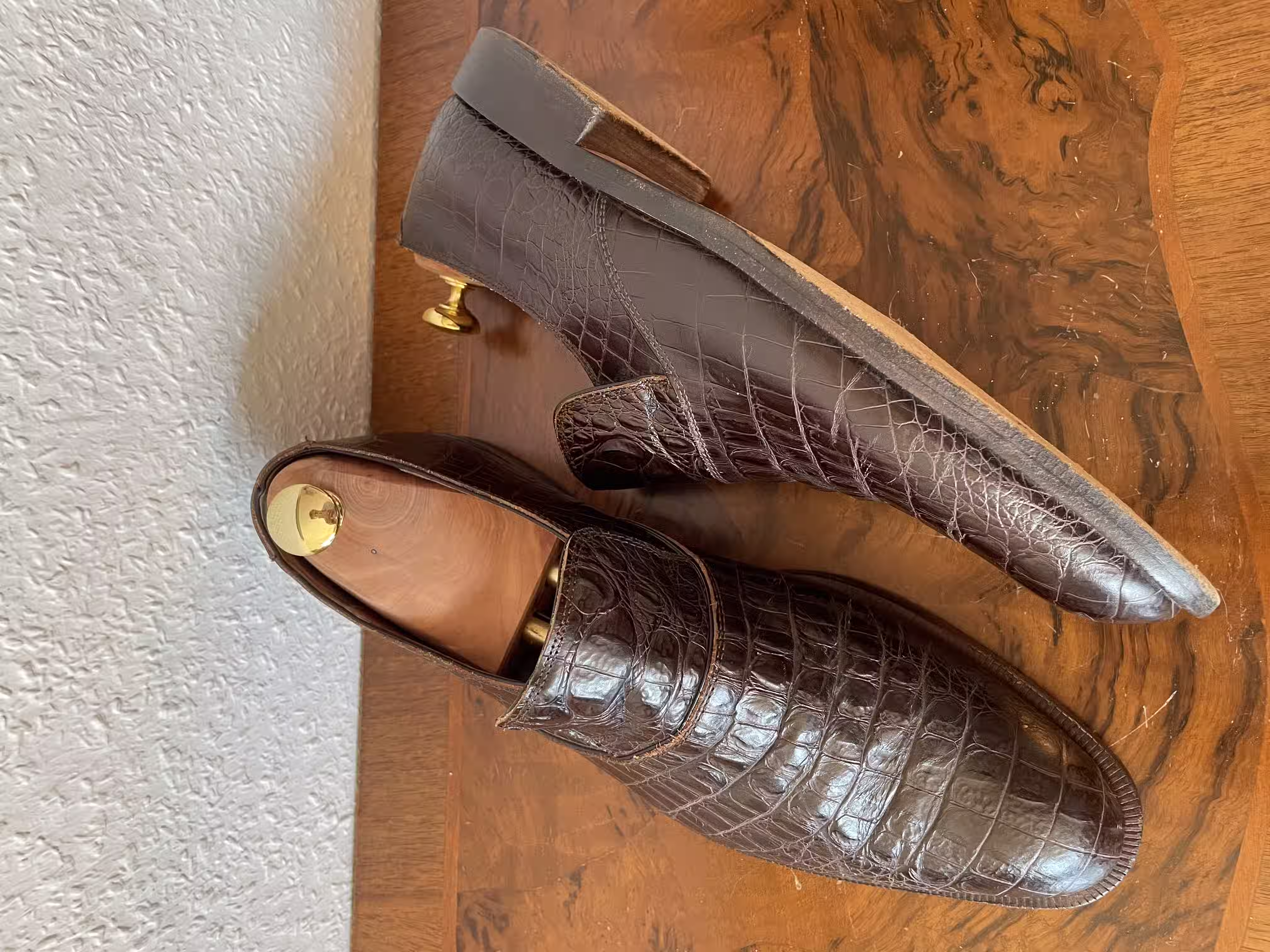 These are very casual loafers with an unusual toe shape and made of snakeskin, whose scales stand out slightly upon closer inspection. It is a pure leisure shoe that, in my opinion, can be well combined with jeans or chinos. Personally, I would only wear such loafers in summer - in my view, snakeskin fits best there because it has a touch of the exotic.