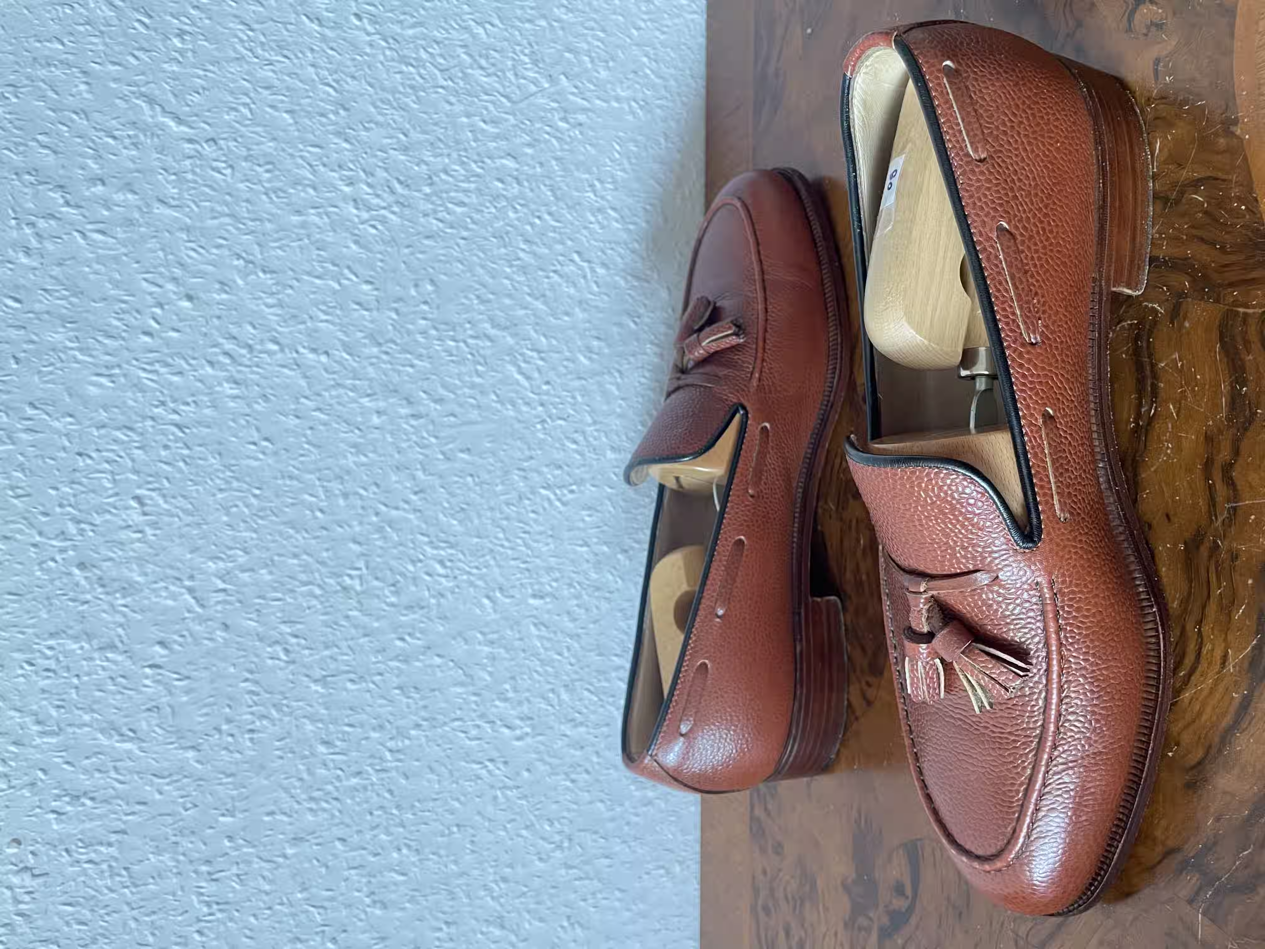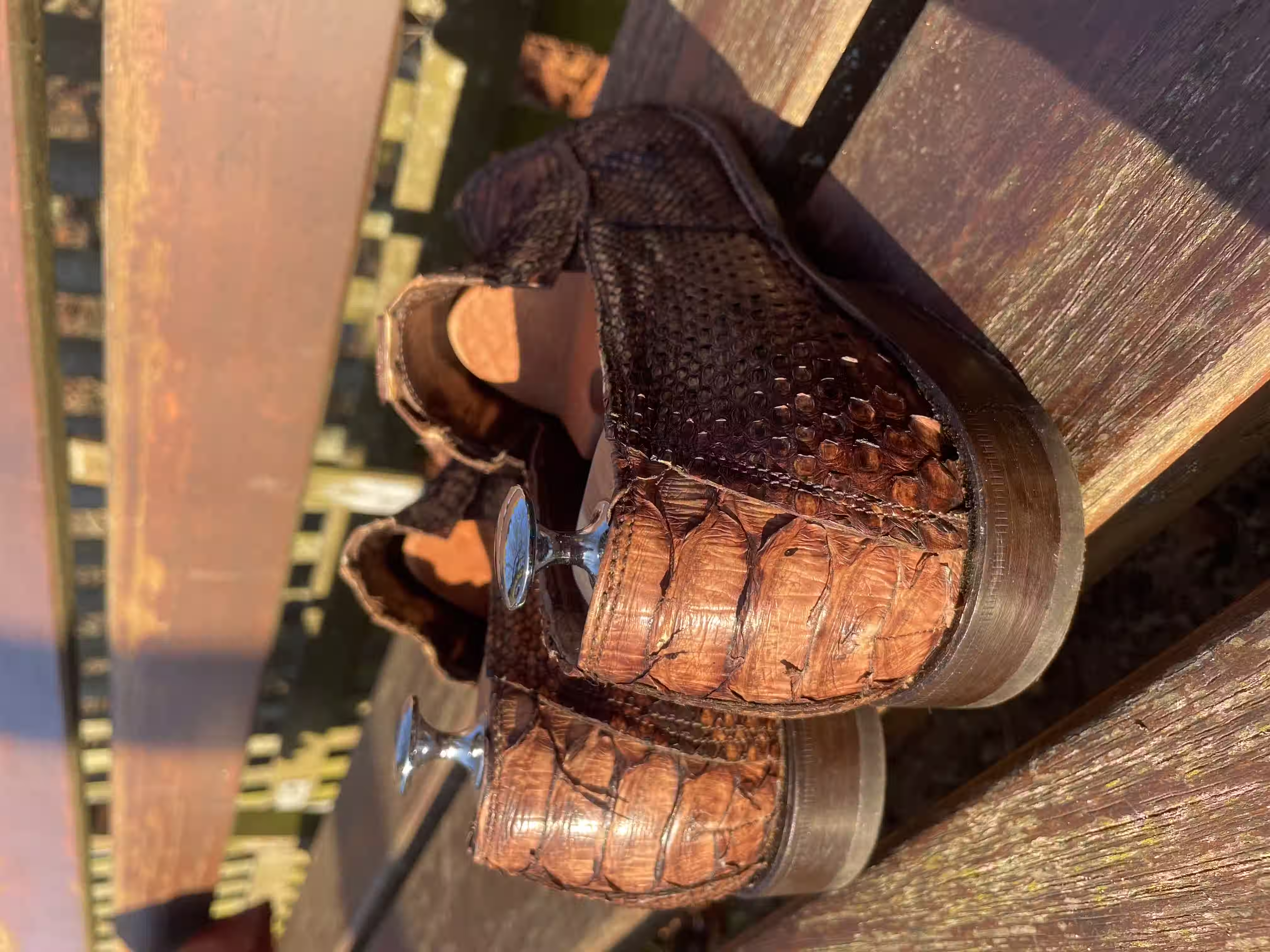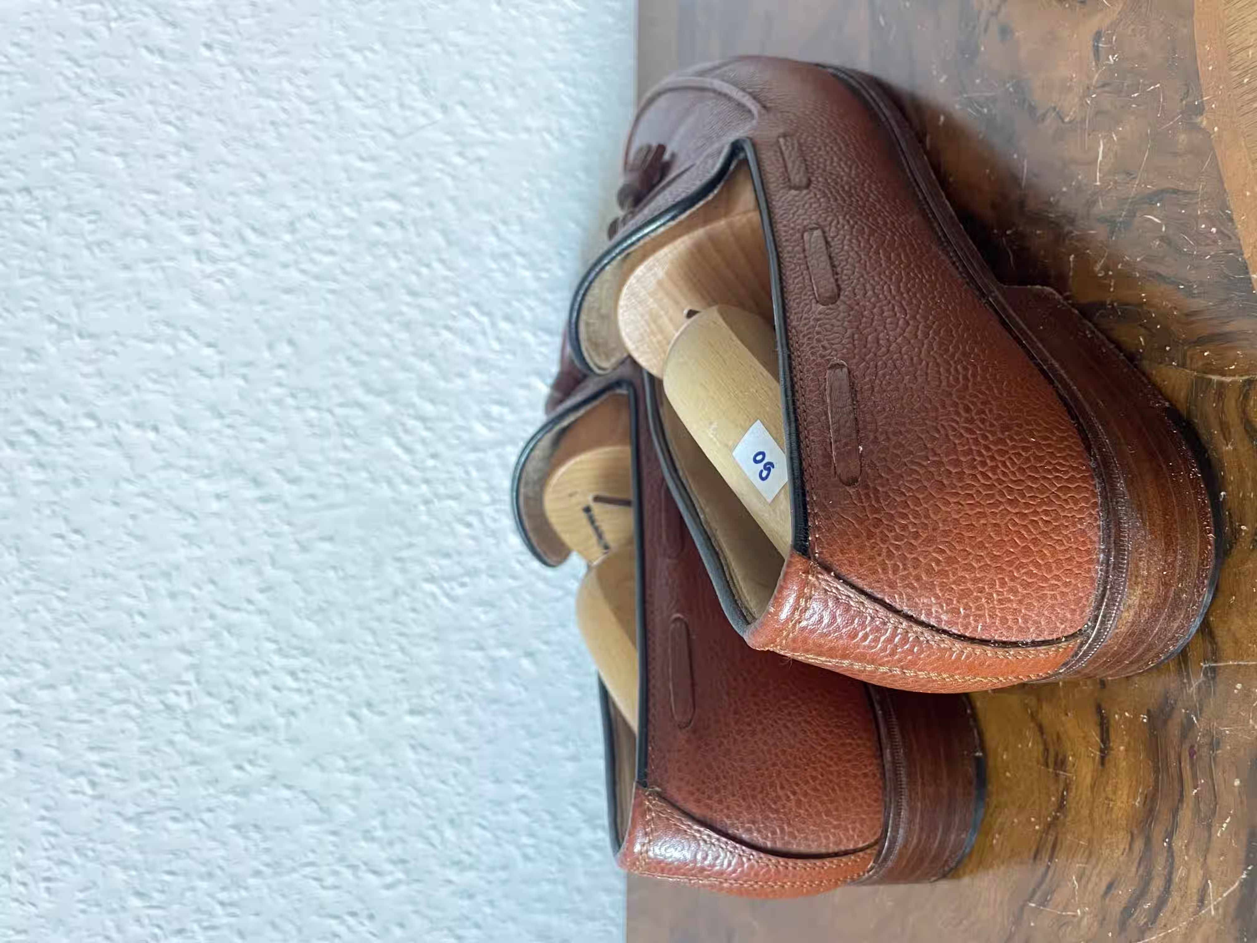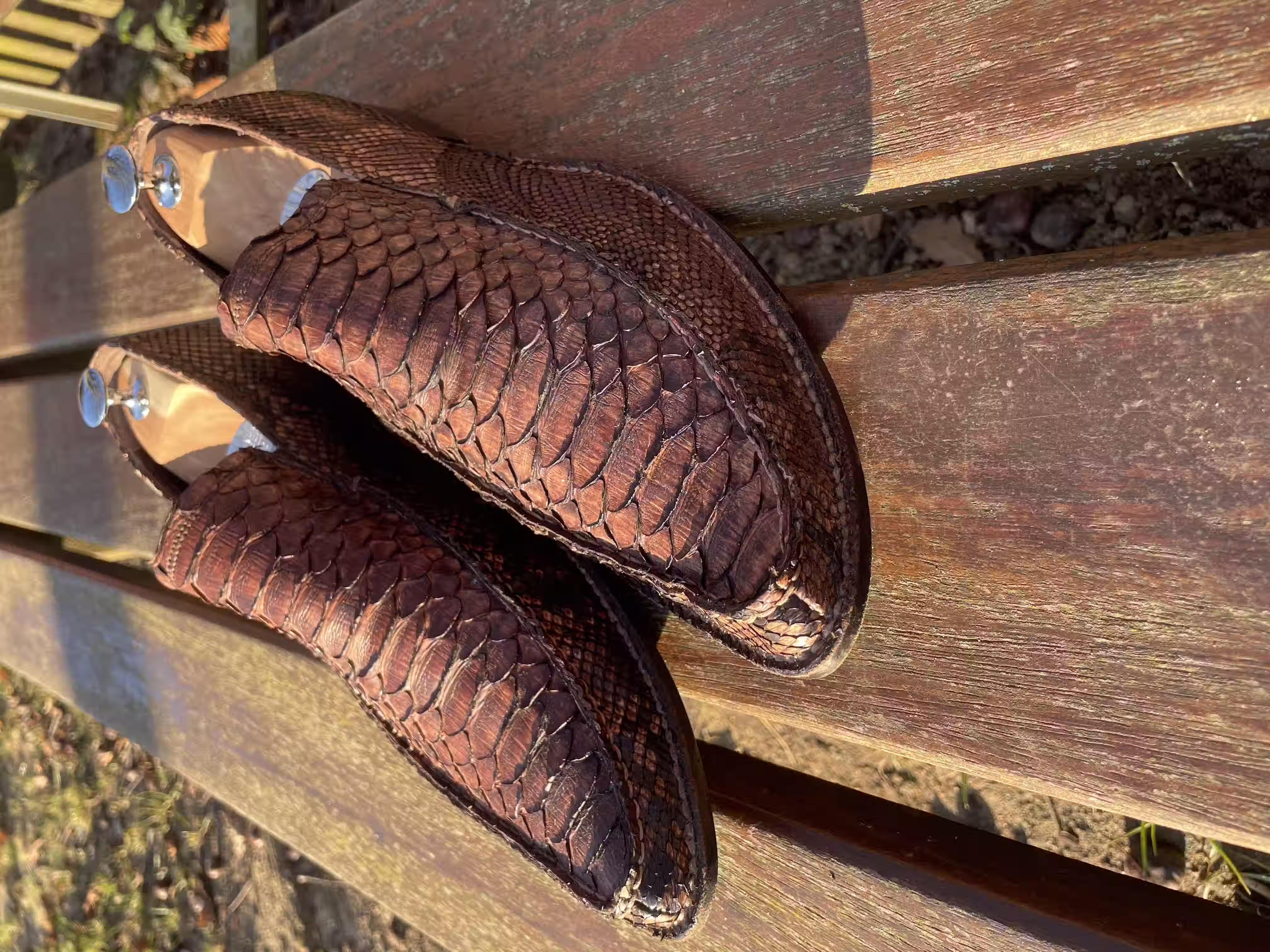 These are very casual loafers with an unusual toe shape and made of snakeskin, whose scales stand out slightly upon closer inspection. It is a pure leisure shoe that, in my opinion, can be well combined with jeans or chinos. Personally, I would only wear such loafers in summer - in my view, snakeskin fits best there because it has a touch of the exotic.