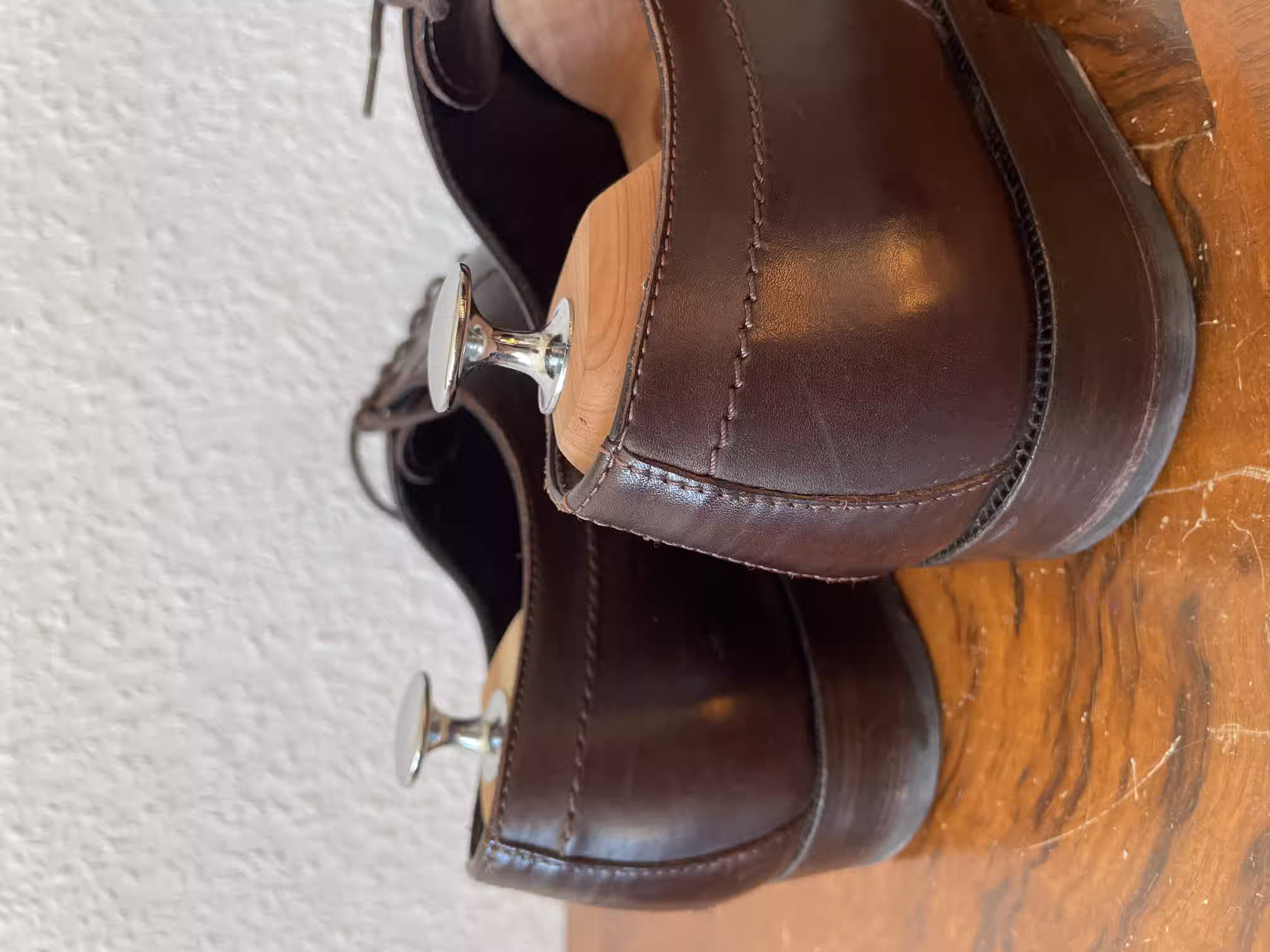 This is another pair of classic Oxfords, featuring the so-called swan neck stitch, but in the less classic color of dark brown. This makes the shoe unsuitable for very formal occasions. However, for occasions where you can wear a non-black suit, this pair of Oxfords is excellent. For jeans, these shoes are actually a bit too refined for me, but with dark jeans and a brown sports coat, I can still imagine the combination working well.