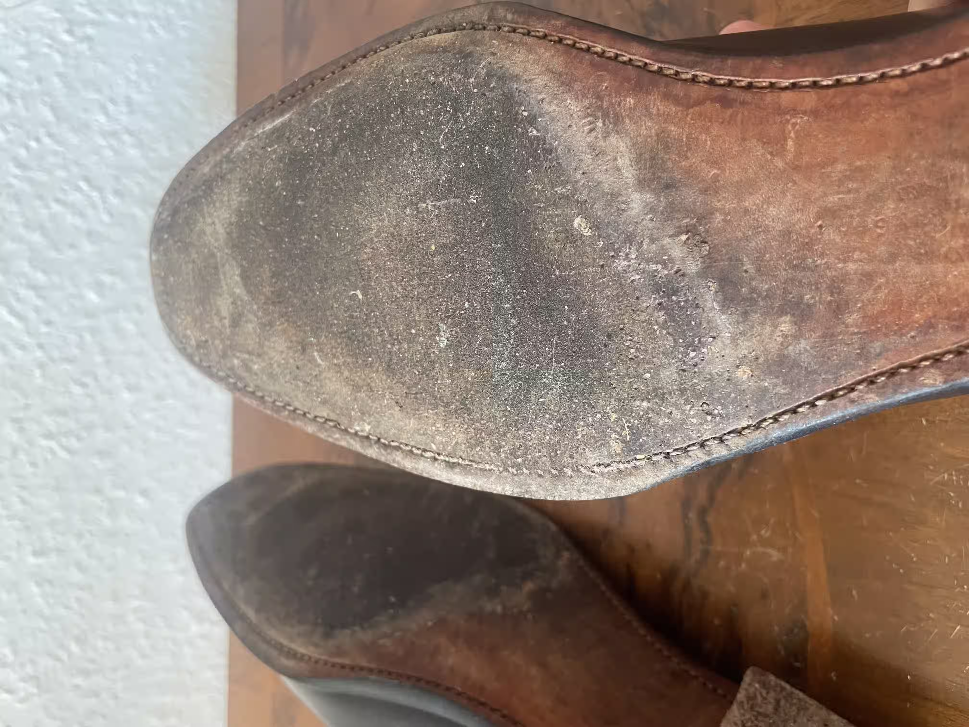 Here you can see a nice way to loosen up black Oxford shoes, which are normally quite serious and formal. This is achieved here primarily through contrast stitching: the roughly parallel seams on the vamp loosen up the shoes. Additionally, all the seams are in white, which further emphasizes the casual character of the shoes. However, you can also see that in many places the seams have absorbed black shoe polish and are therefore less prominent. In the long run, I can imagine bringing the contrast stitching uniformly towards a blackish tone; then they would also match the black laces better. If the white contrast stitching had been stronger, then in my opinion, white laces would fit even better. In both cases, I find the shoe quite suitable for everyday life and for a casual office environment.