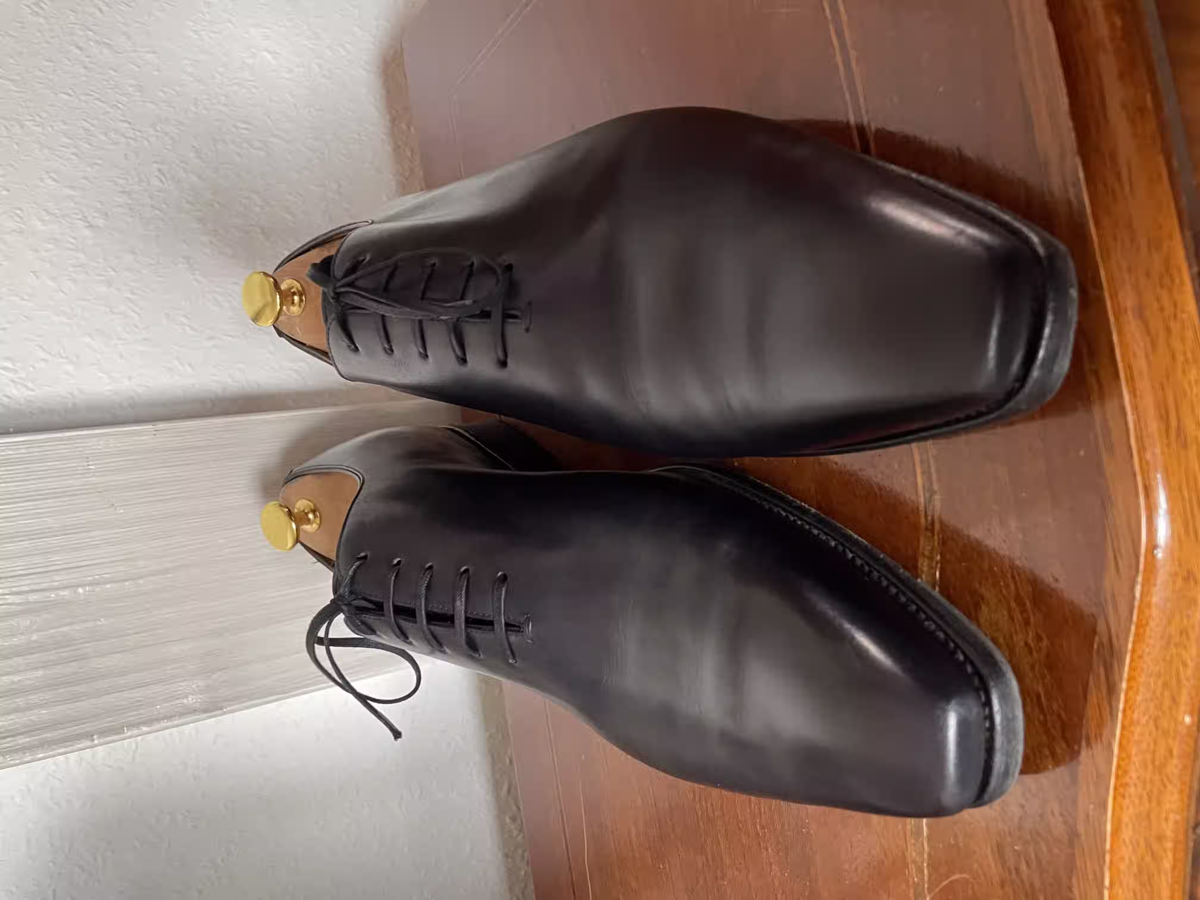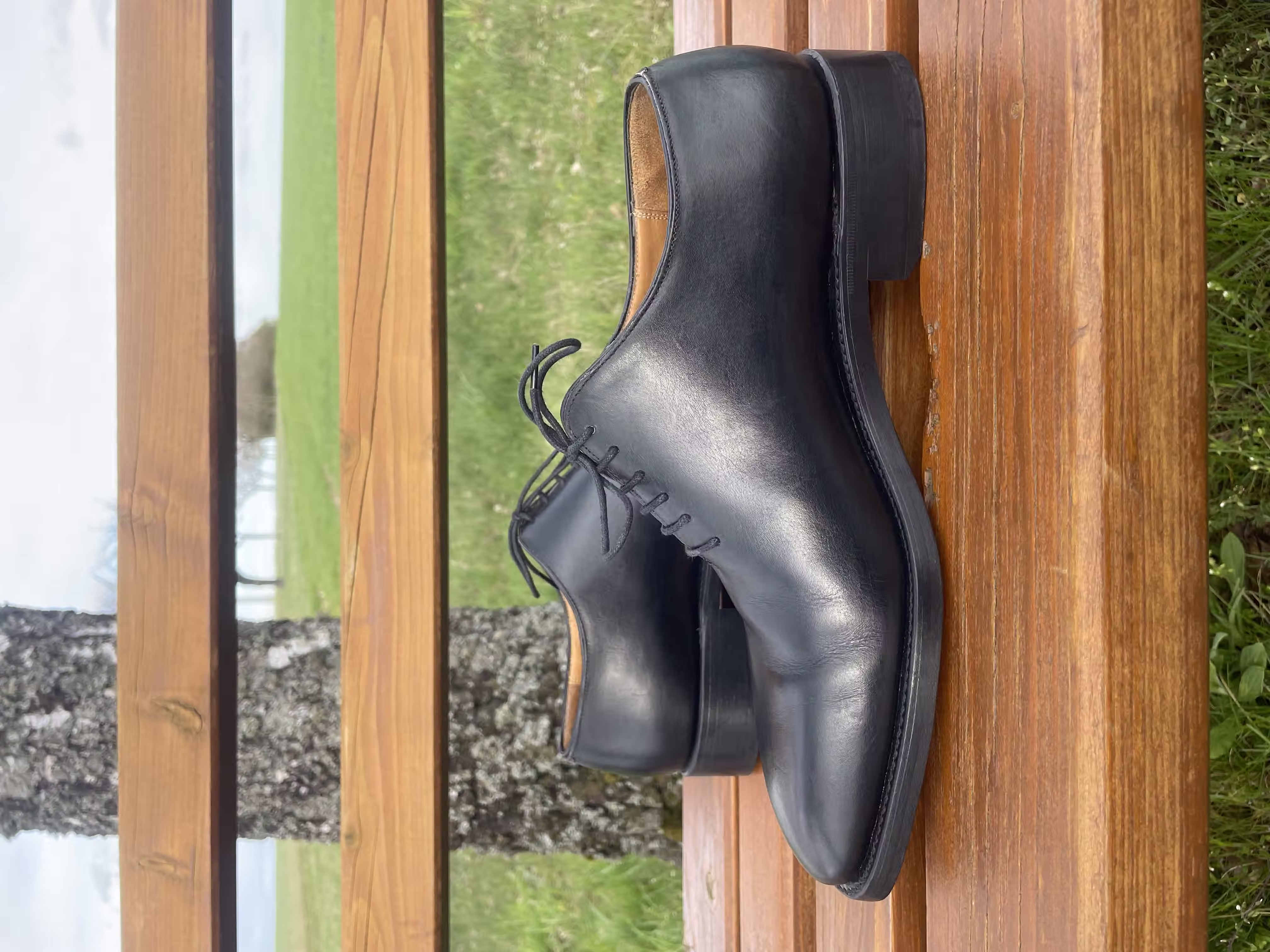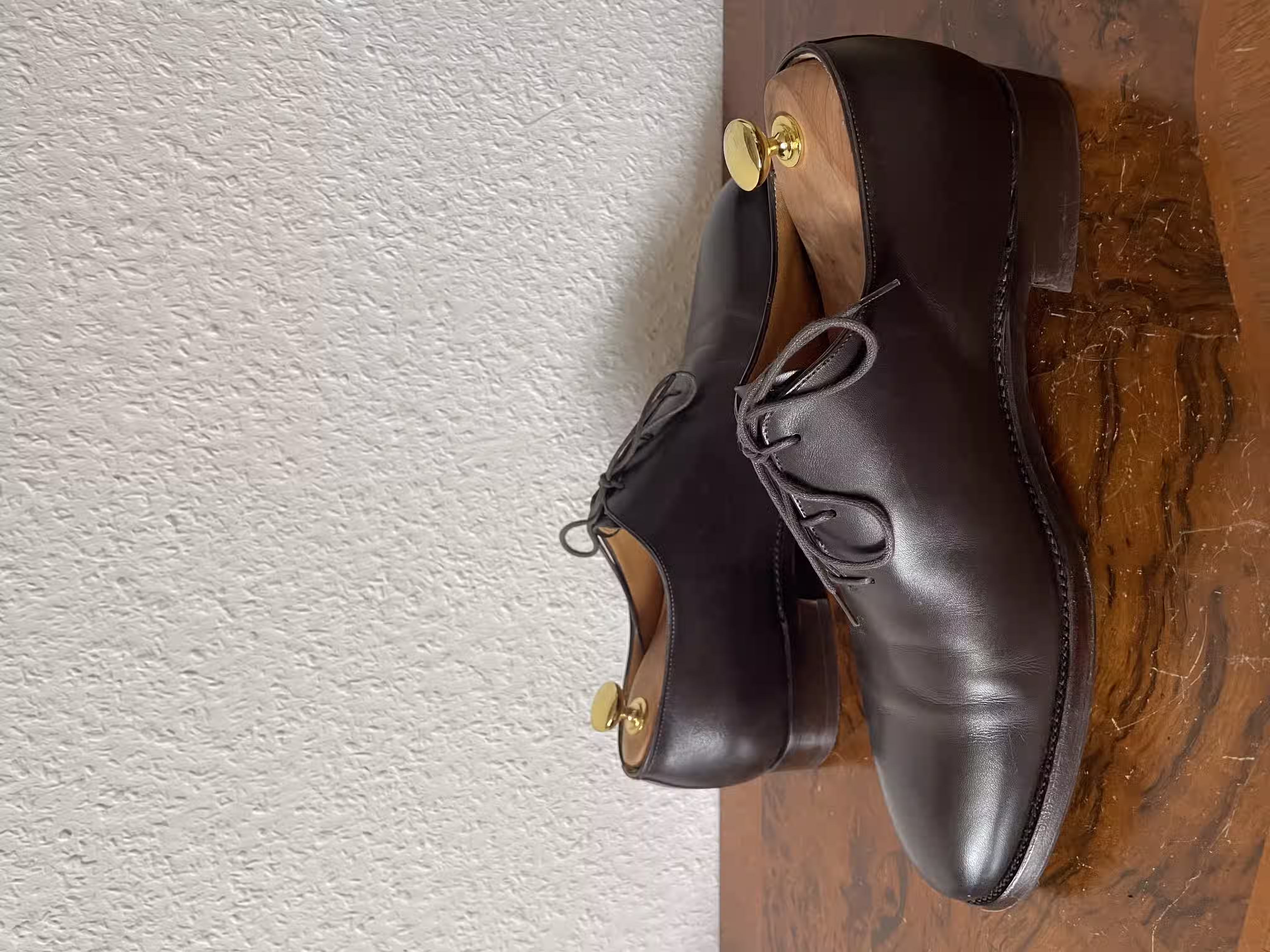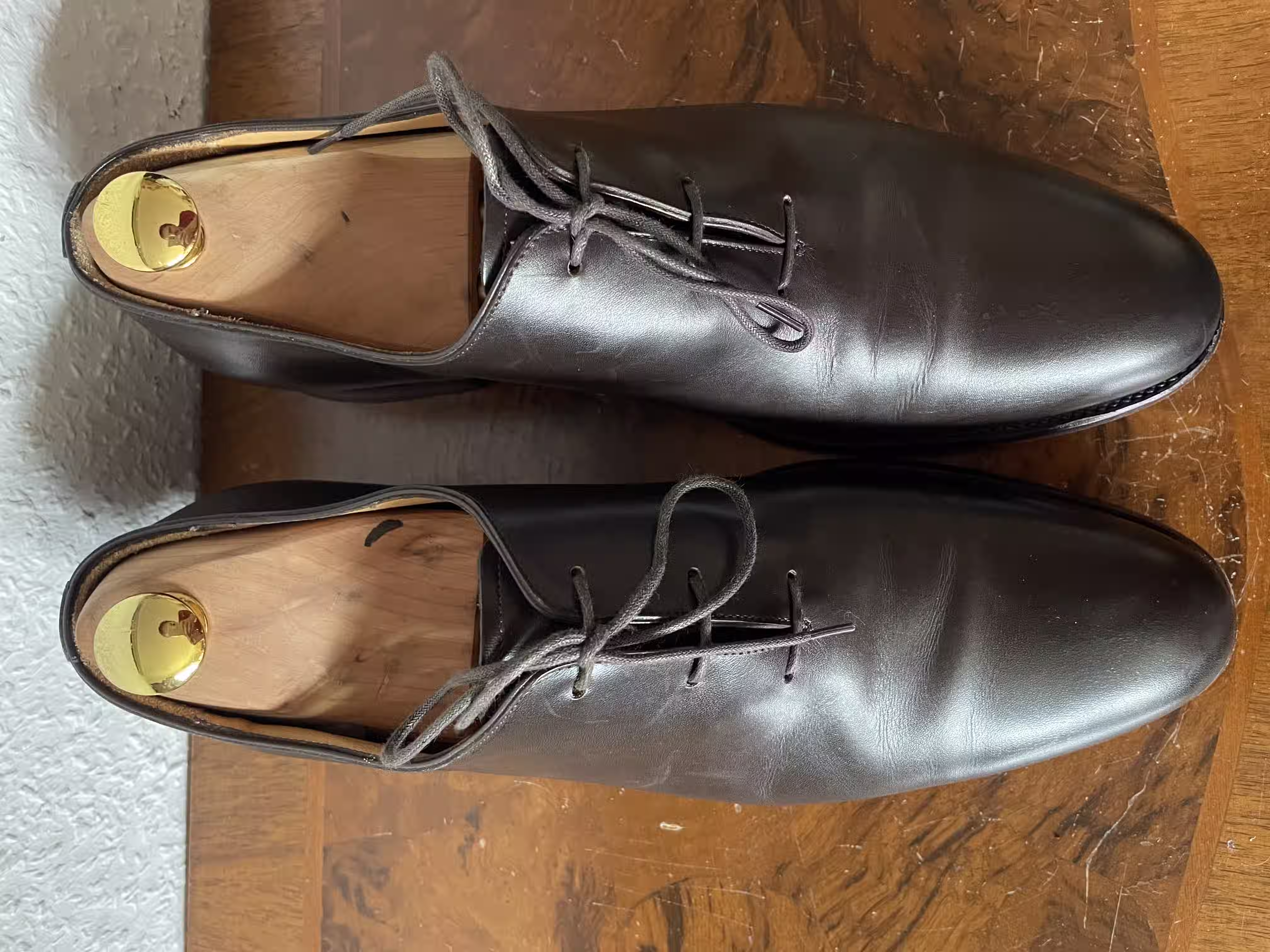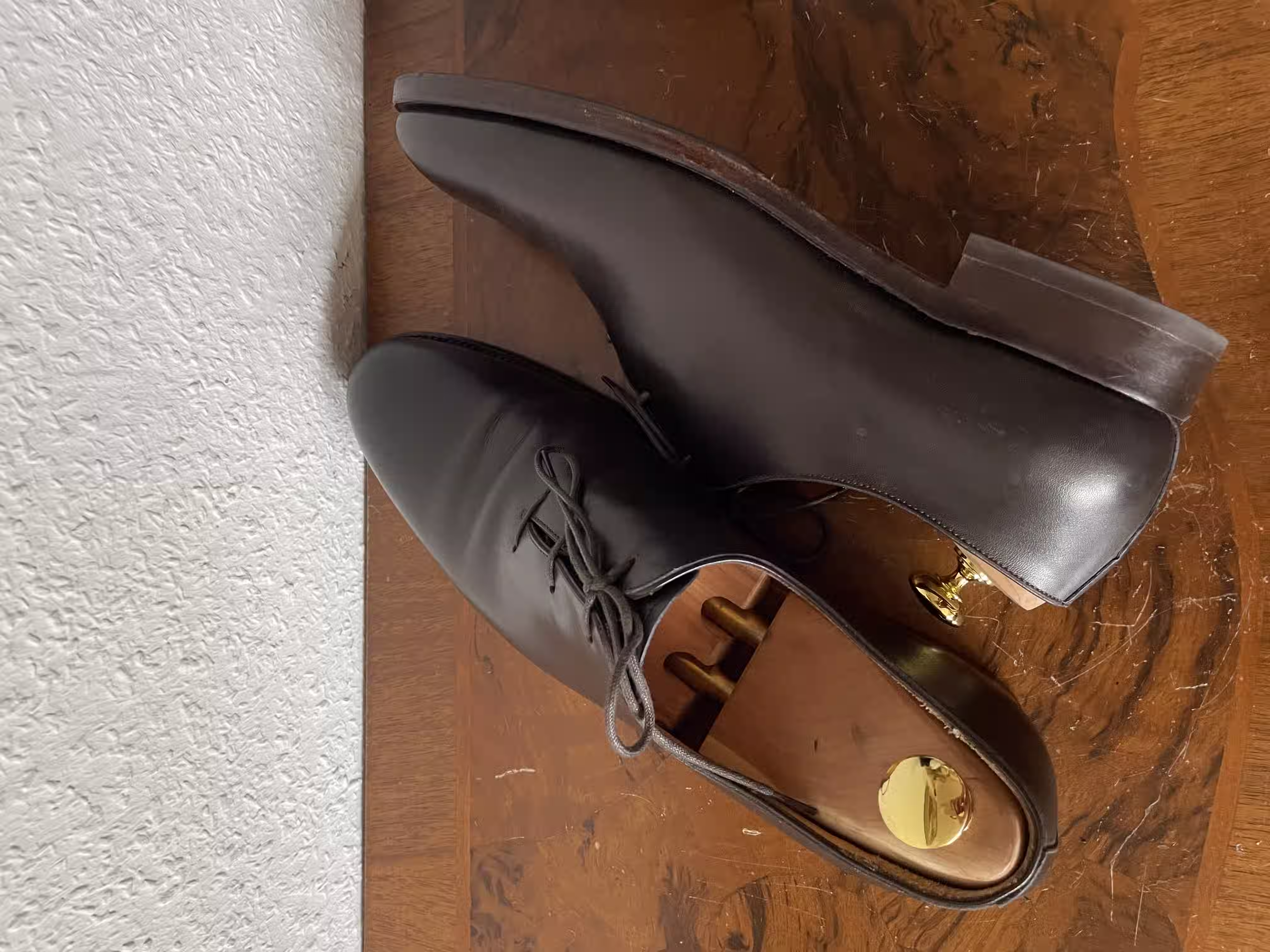 What is special about this actually dark-blue wholecut oxford are the angular toes, which stand out on this otherwise purist-looking shoe. In my view, these are very good shoes for semi-formal occasions, where they can really shine. For truly formal occasions, they are too playful because of the eye-catching toe shape and also because of the color.