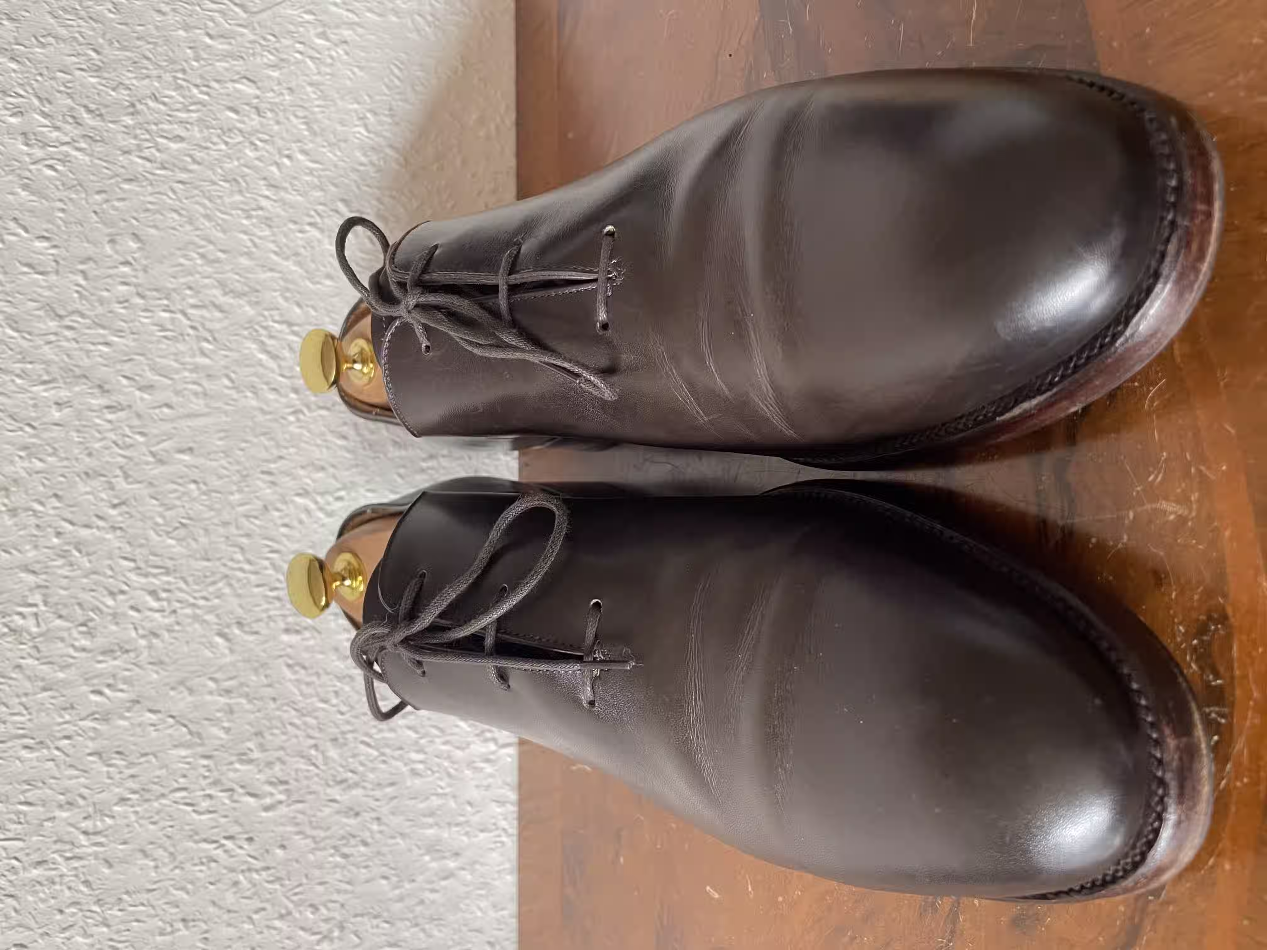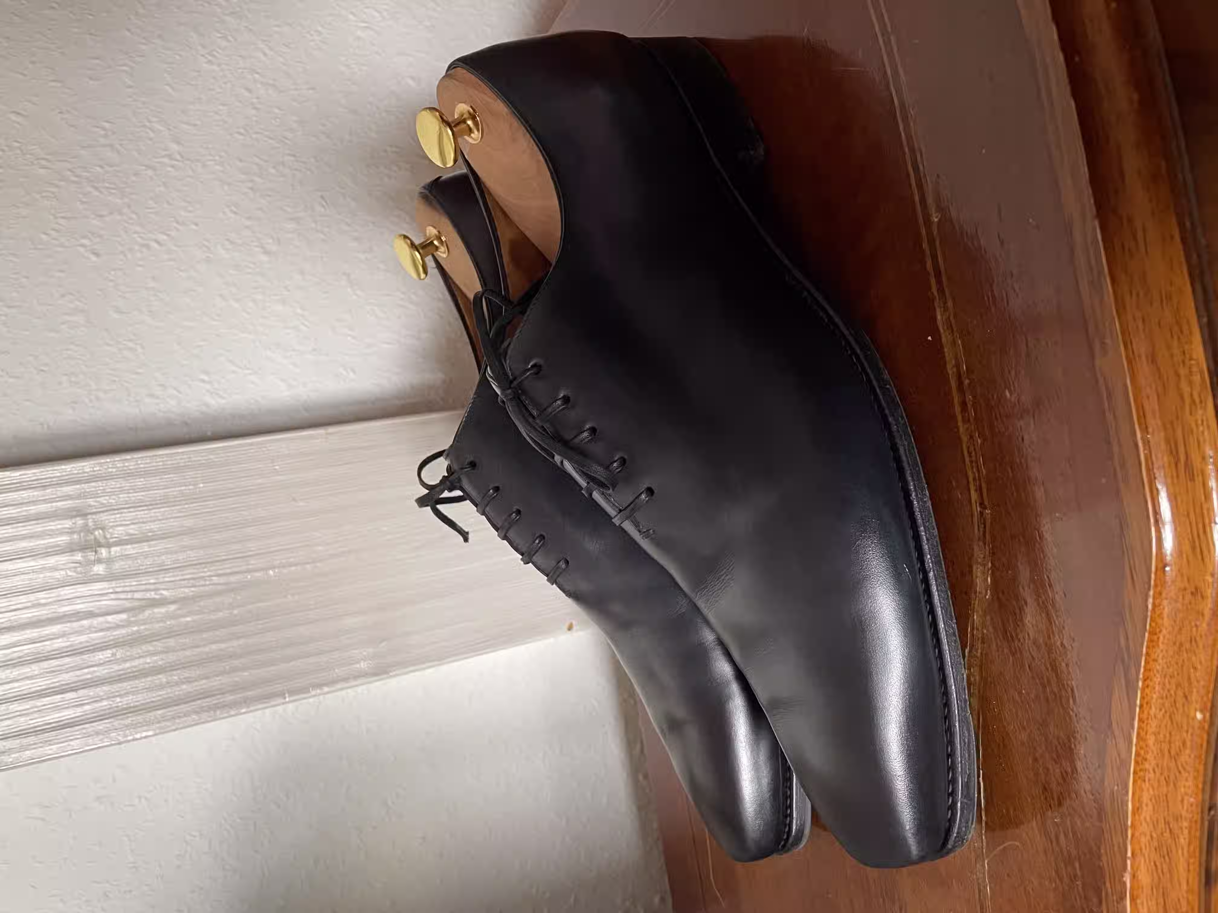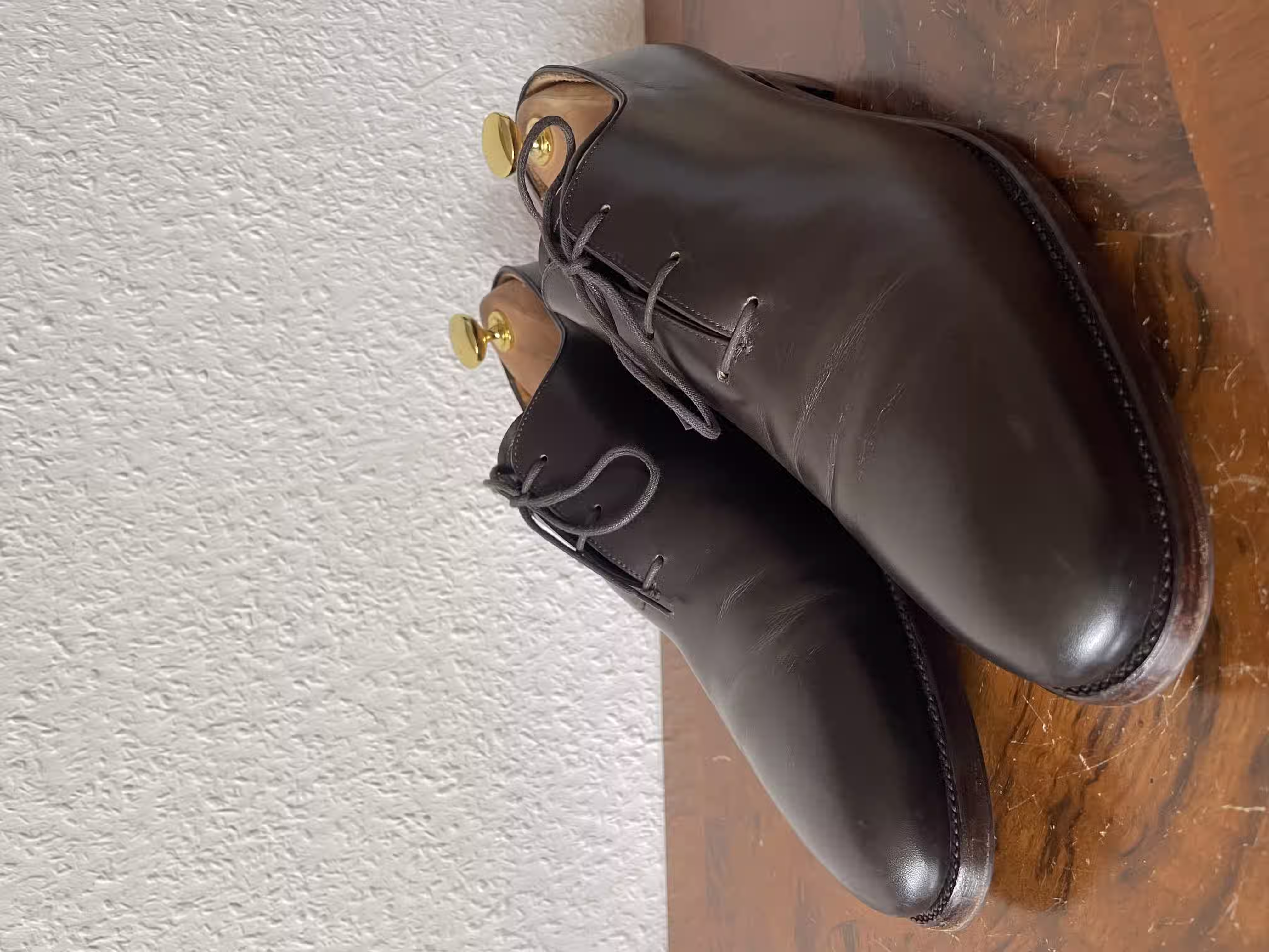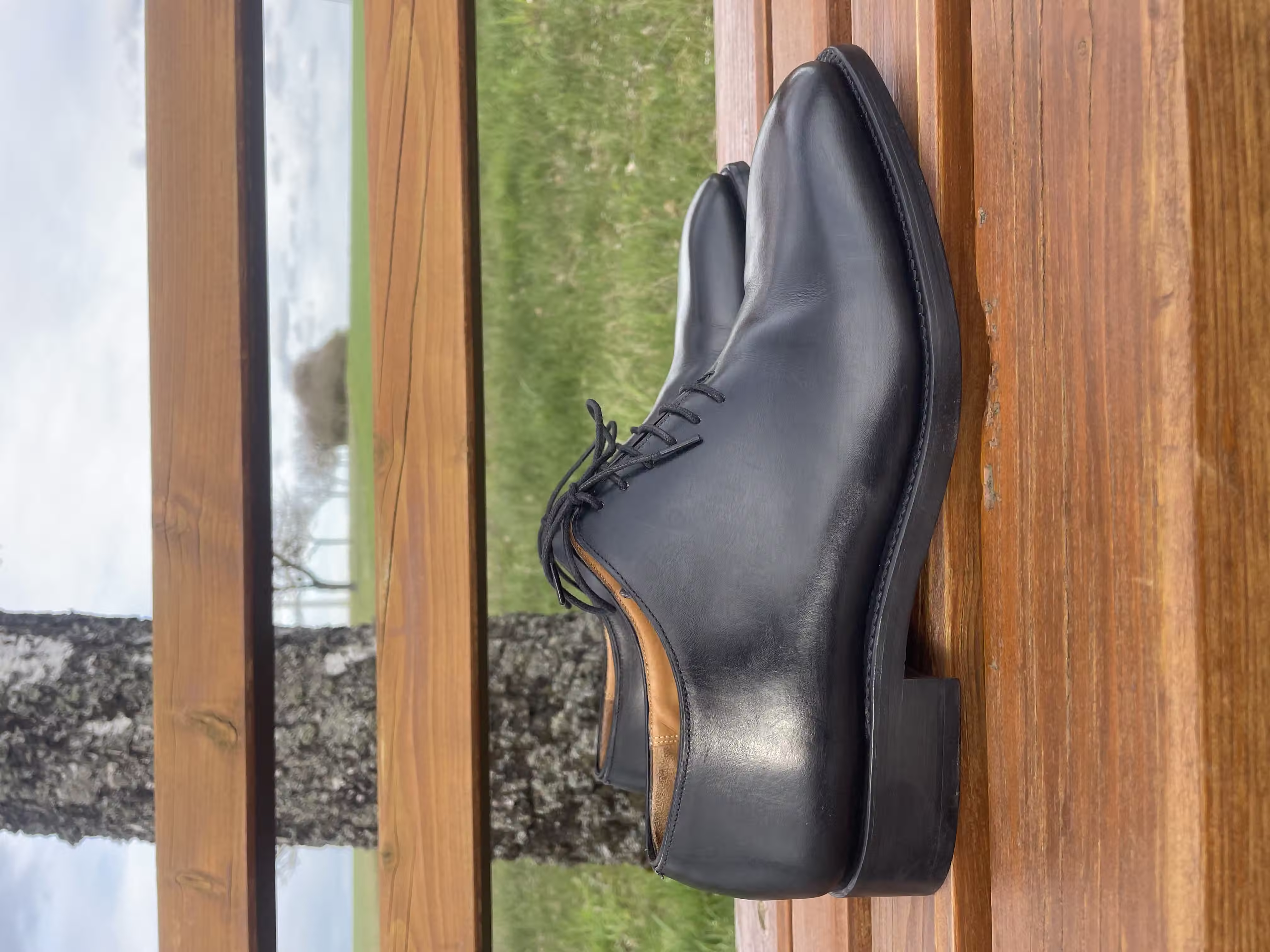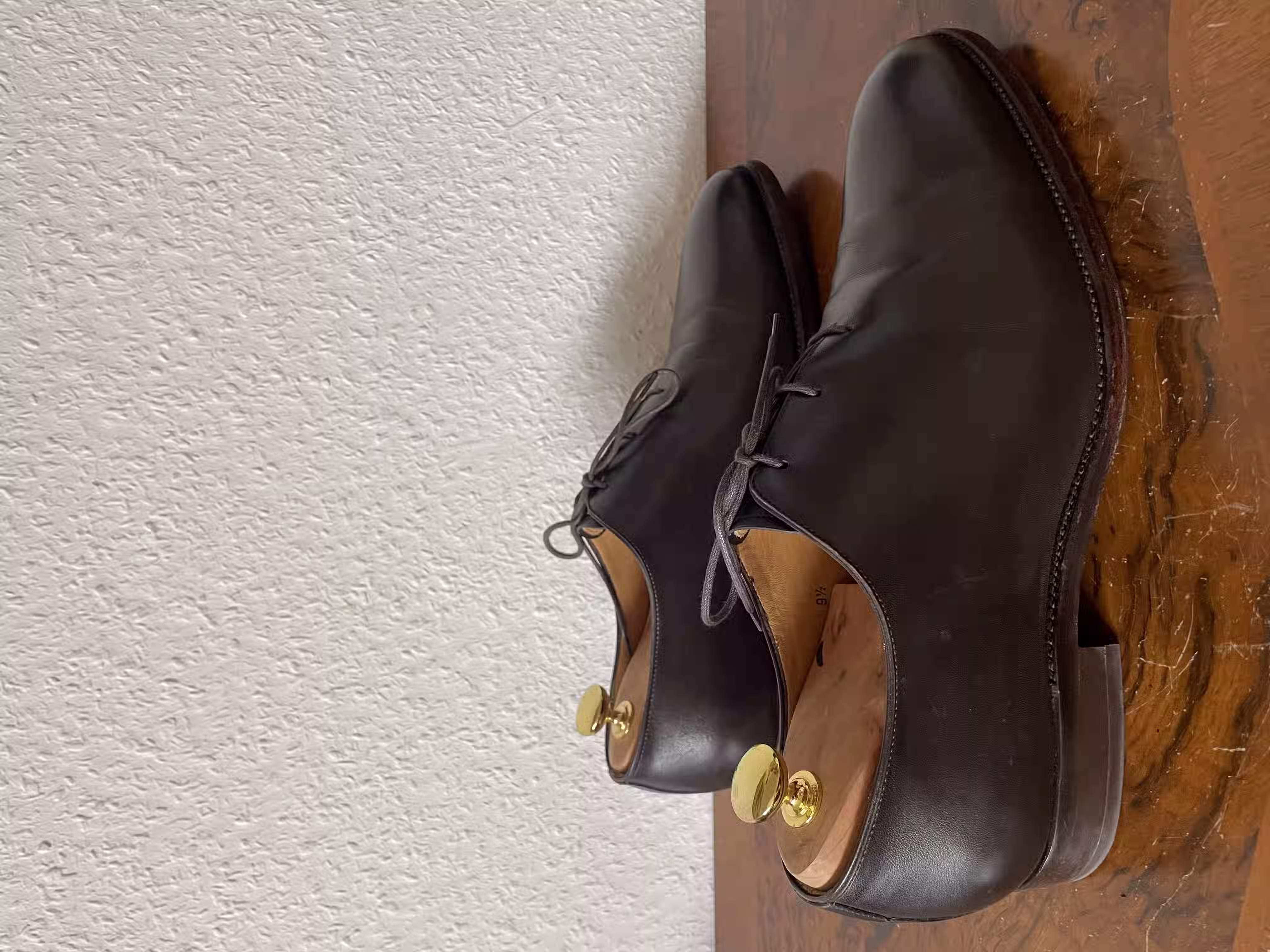 What is special about this actually dark-blue wholecut oxford are the angular toes, which stand out on this otherwise purist-looking shoe. In my view, these are very good shoes for semi-formal occasions, where they can really shine. For truly formal occasions, they are too playful because of the eye-catching toe shape and also because of the color.