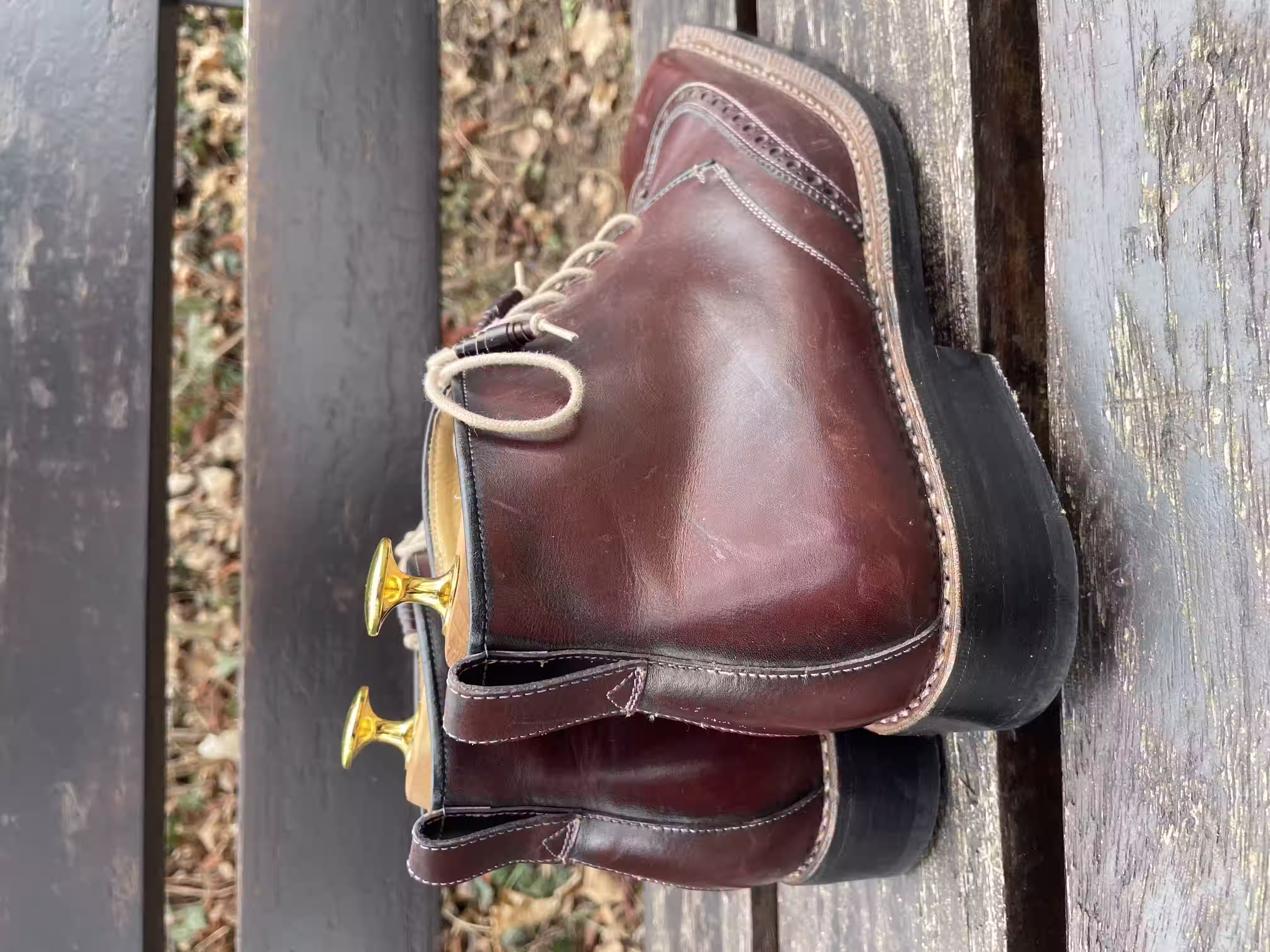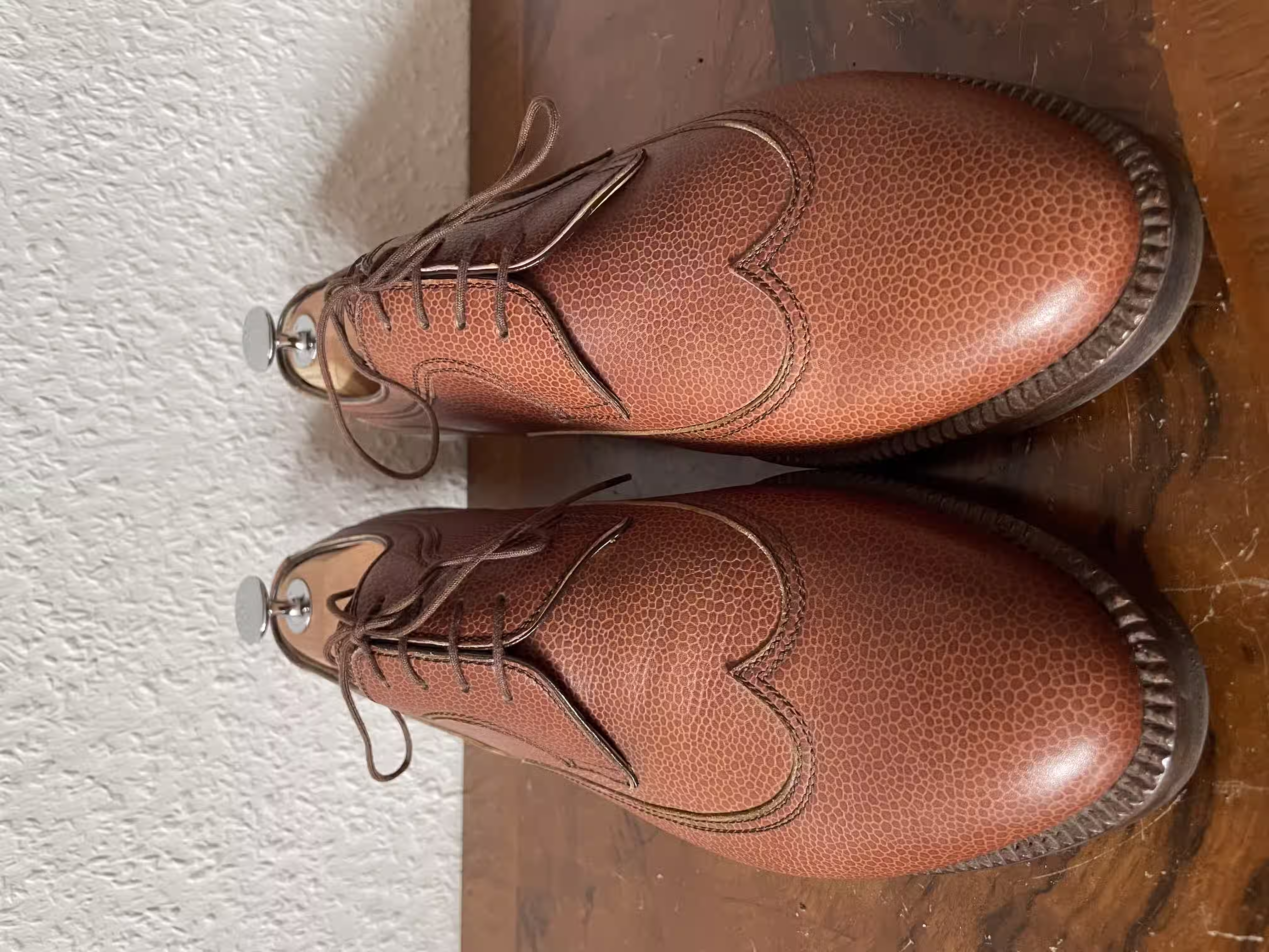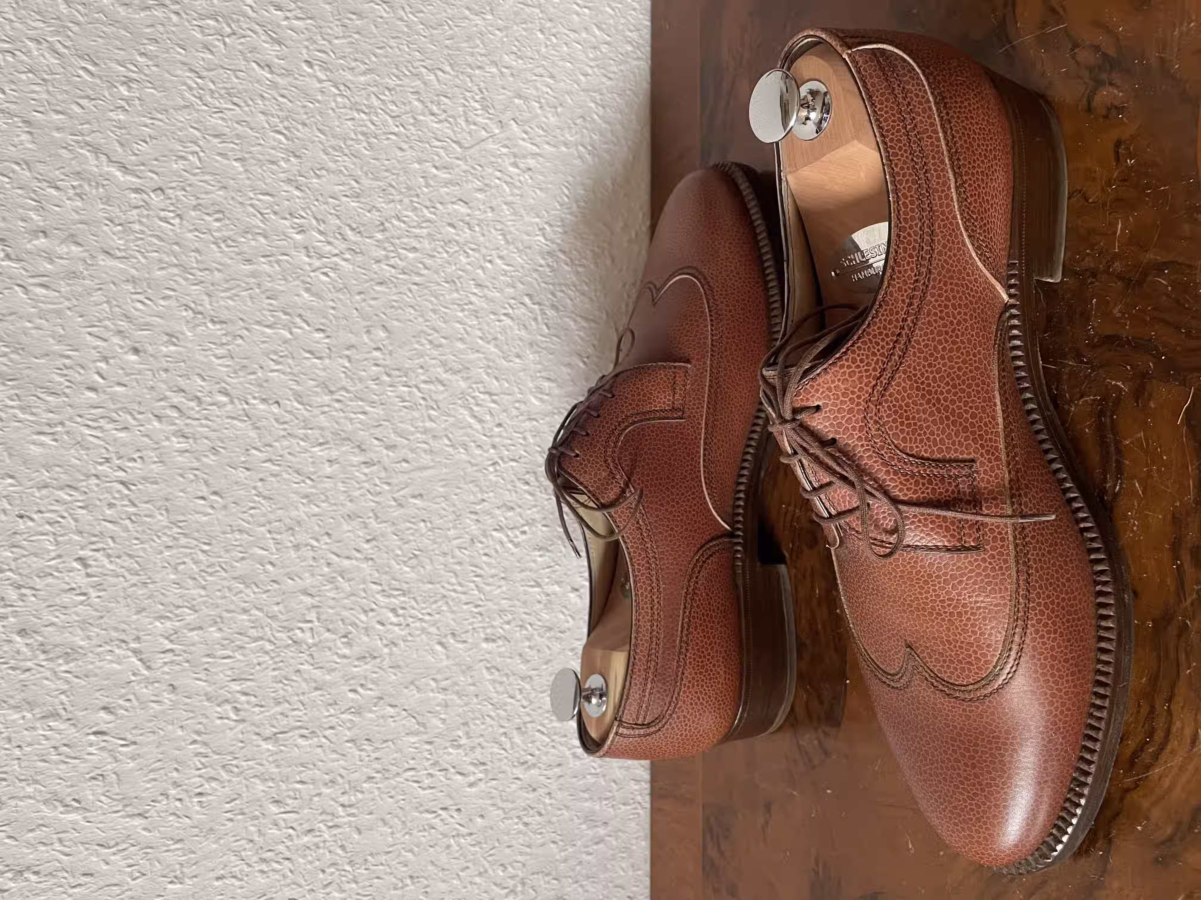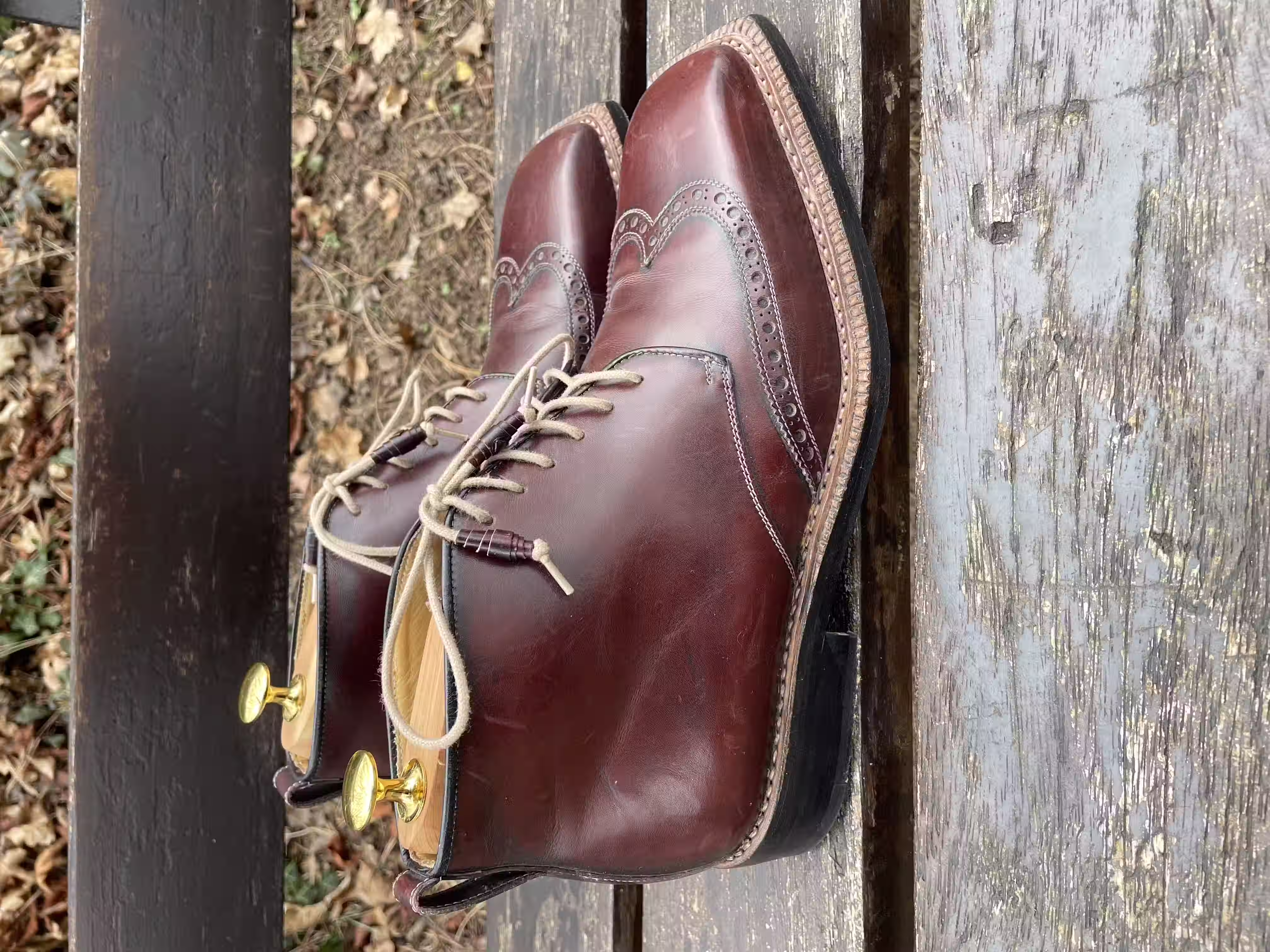 Here, the wing cap is provided along its edges with a strip of perforations, the wingtip perforation pattern. Something like this is typical of what is known as a quarter brogue on its toe cap. Here, however, we have a wing cap, and therefore this shoe is something between a quarter brogue and a semi brogue—though it is closer to the quarter brogue.