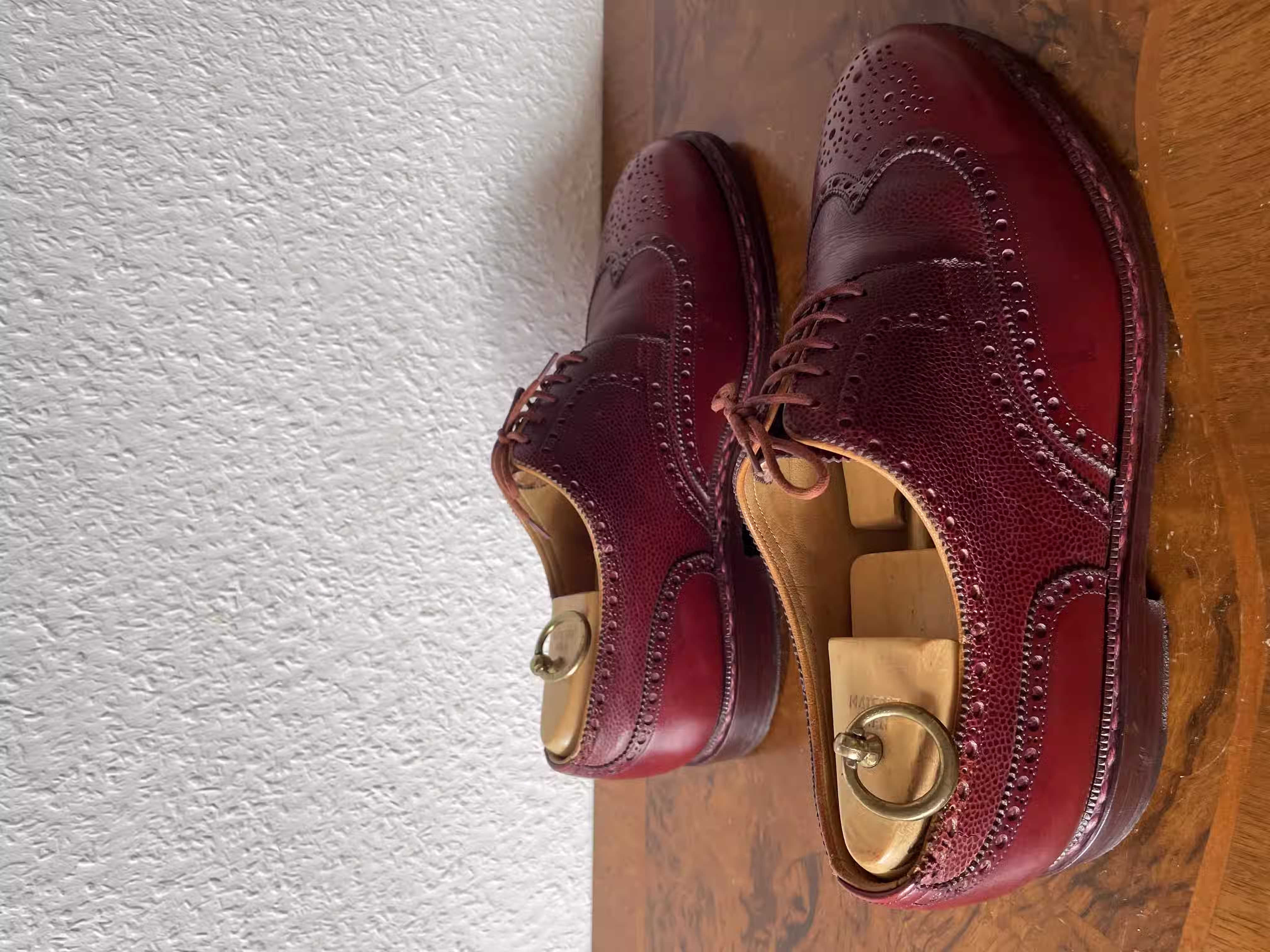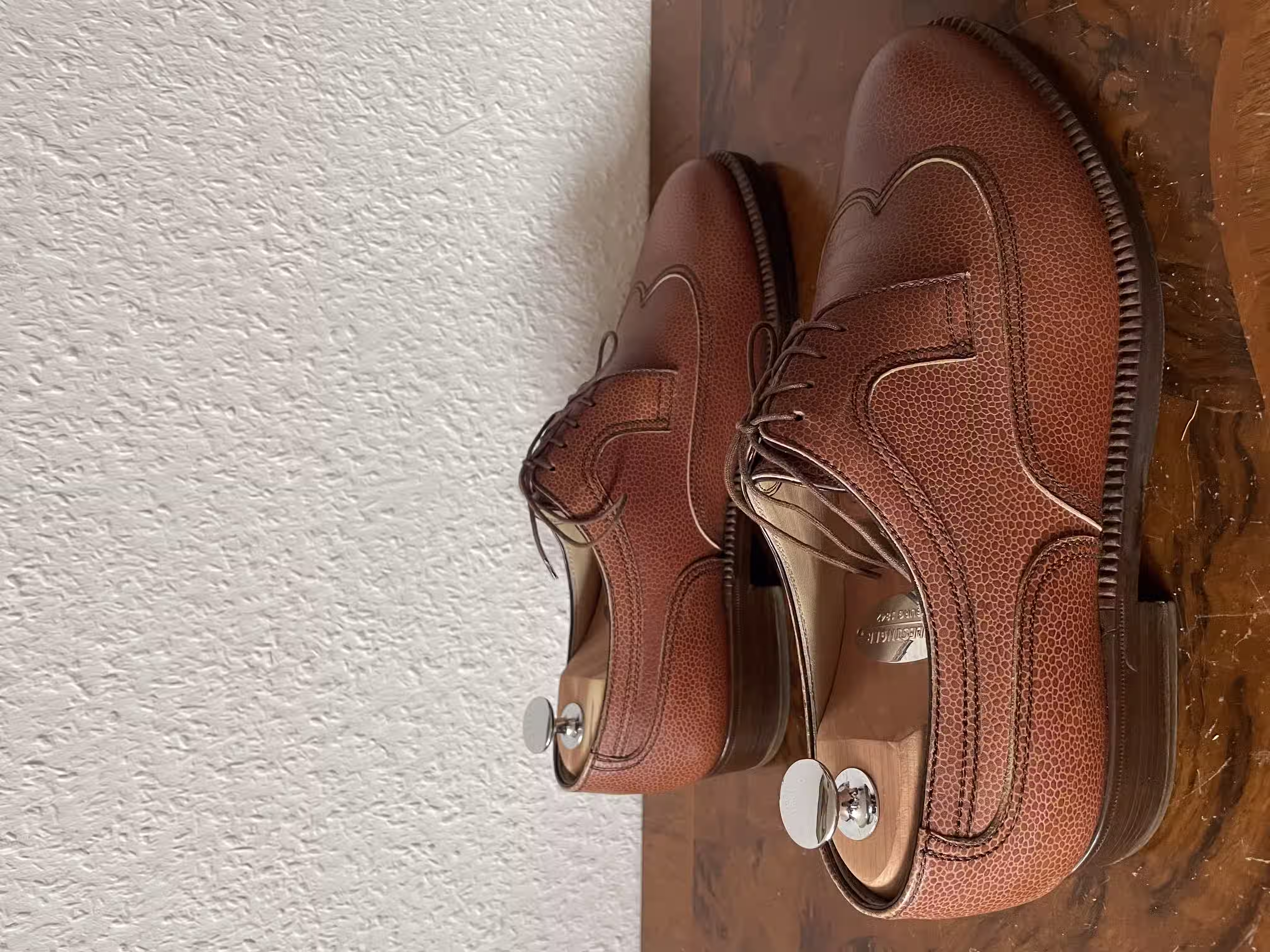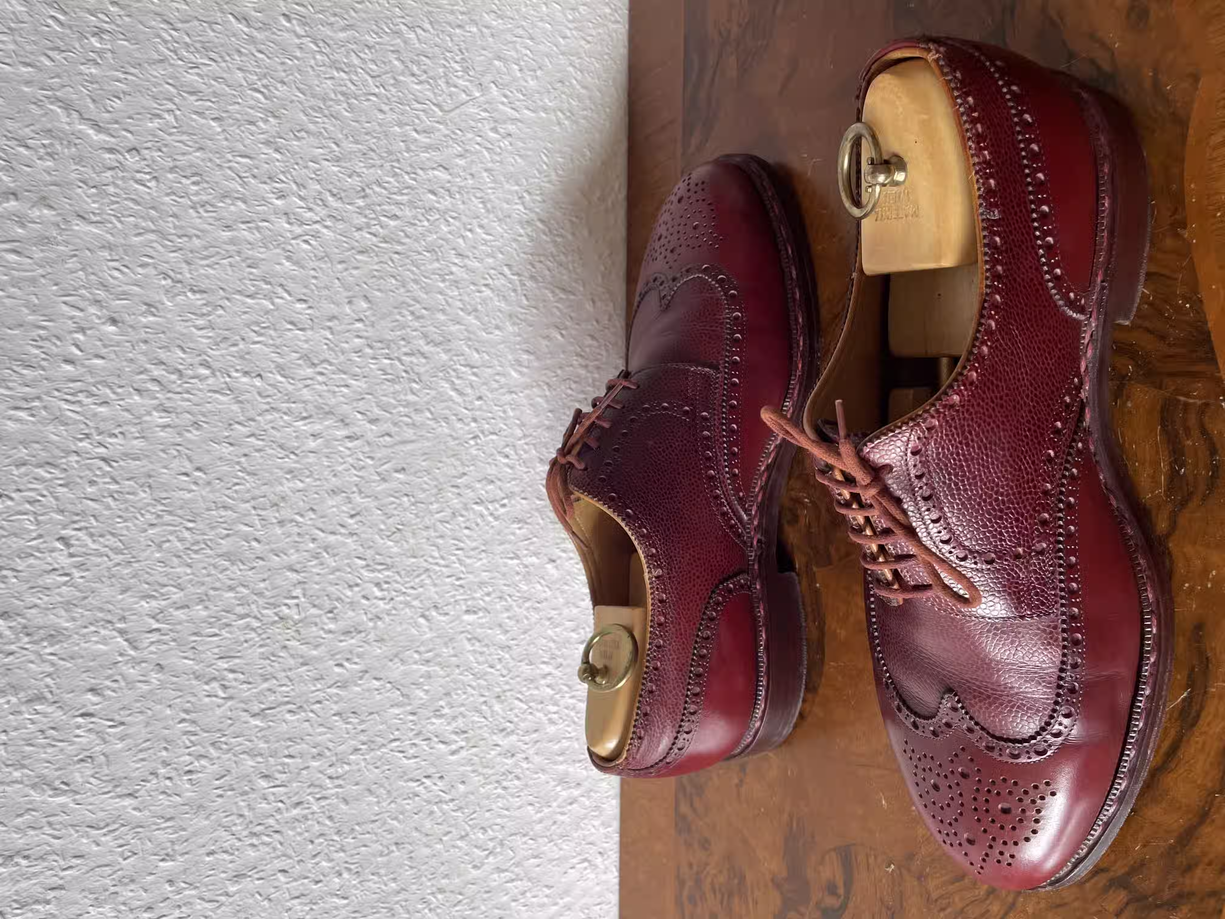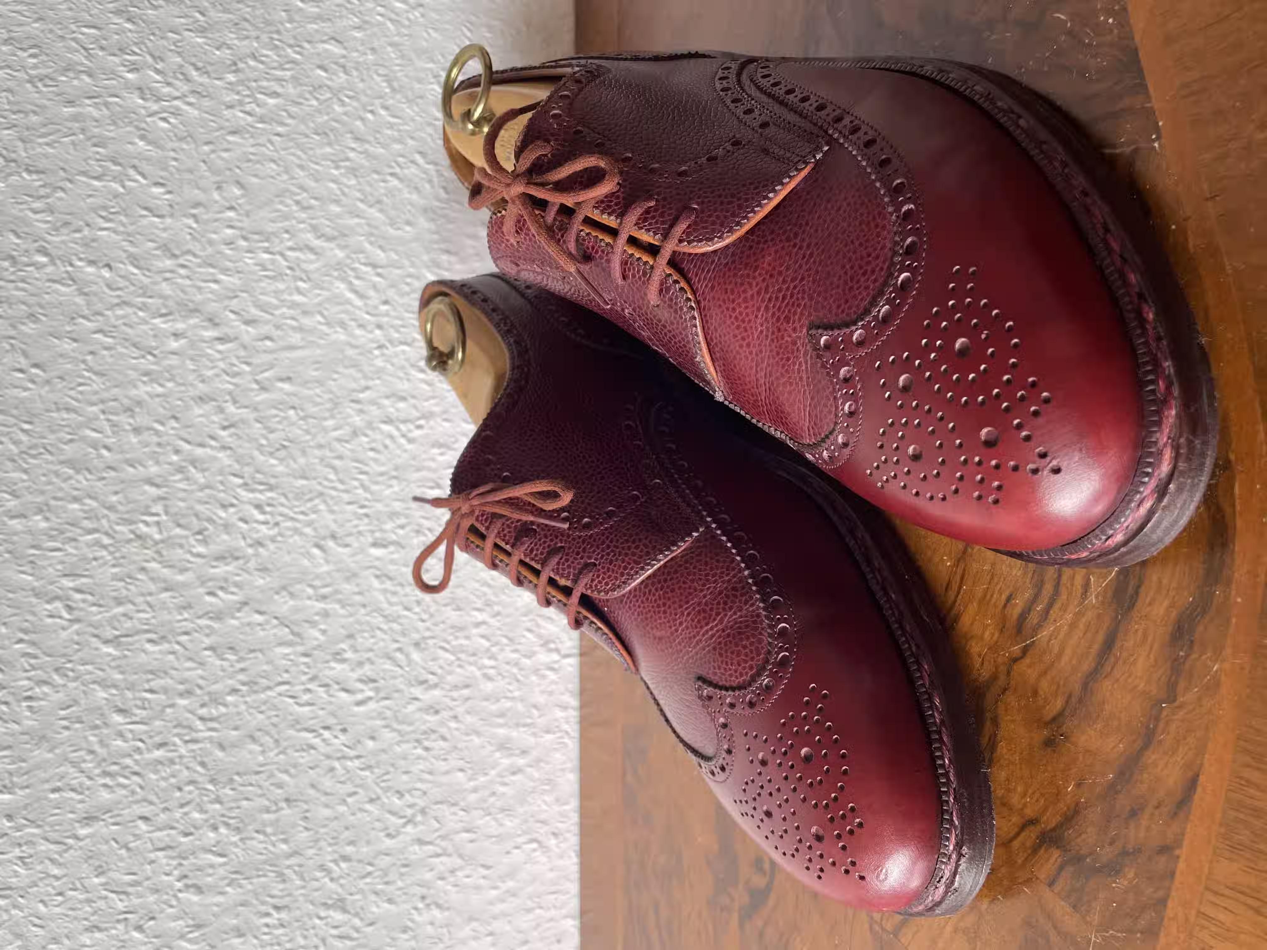 You can also see at the transition that the wing cap is an additional layer of leather that is placed on top, glued, and stitched. This automatically reinforces the toe. Another striking detail: the wing cap extends far beyond the toe all the way to the side of the shoe. That makes it less restrained as a decoration than a simple toe cap.