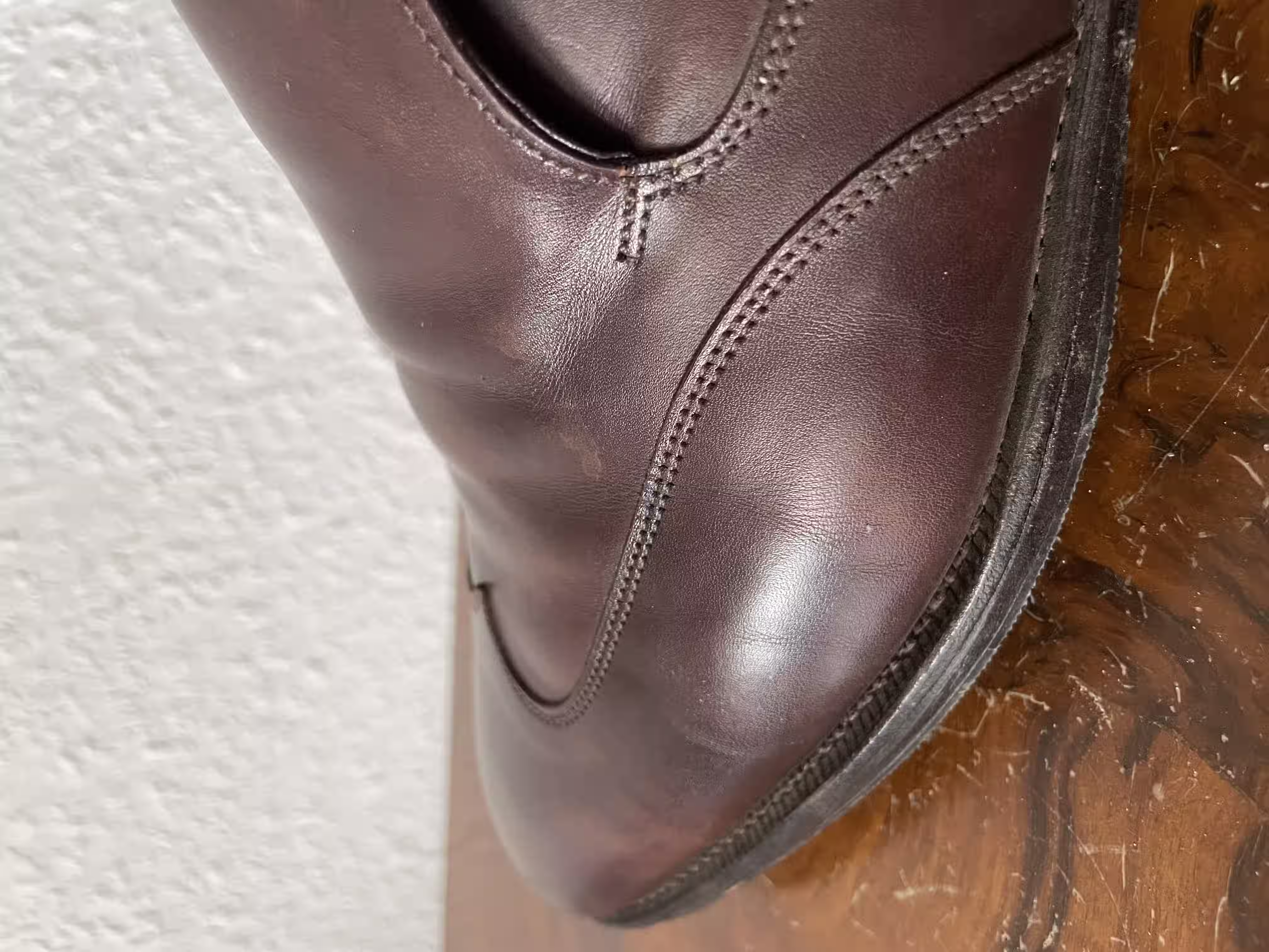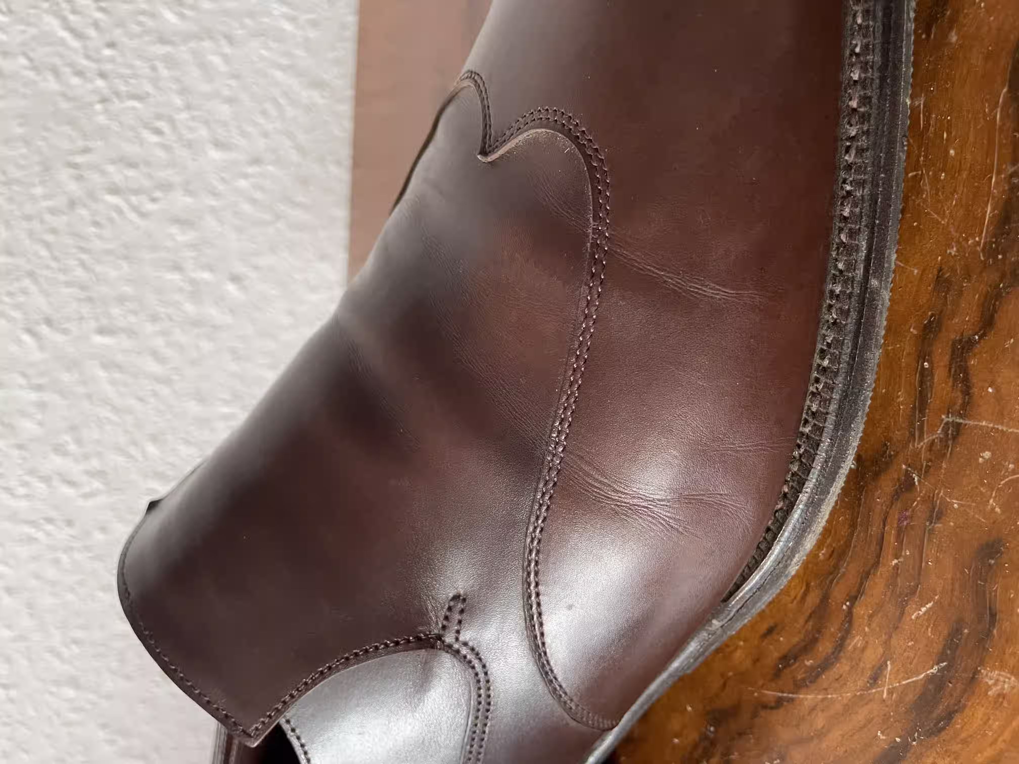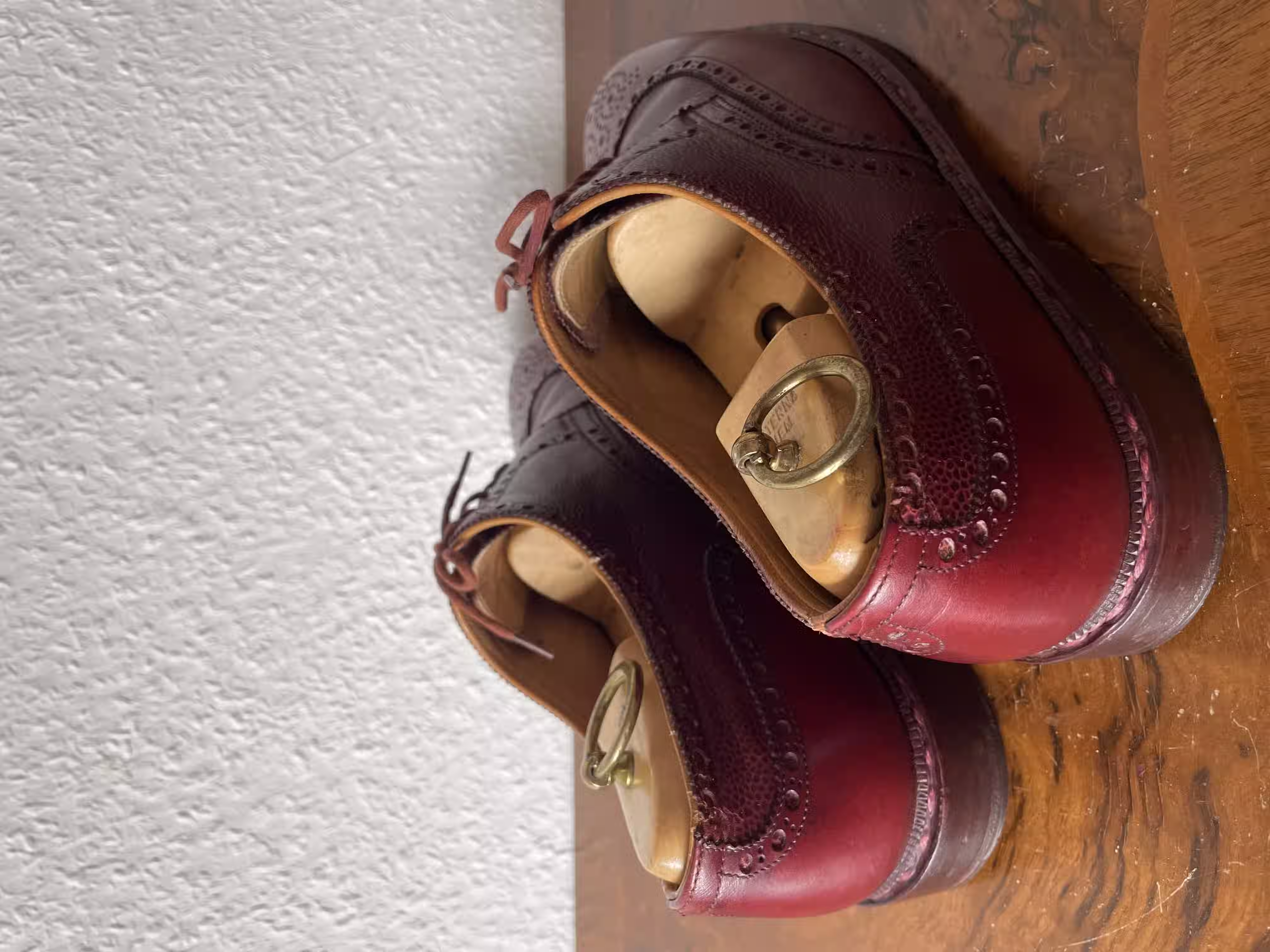 You can also see at the transition that the wing cap is an additional layer of leather that is placed on top, glued, and stitched. This automatically reinforces the toe. Another striking detail: the wing cap extends far beyond the toe all the way to the side of the shoe. That makes it less restrained as a decoration than a simple toe cap.
