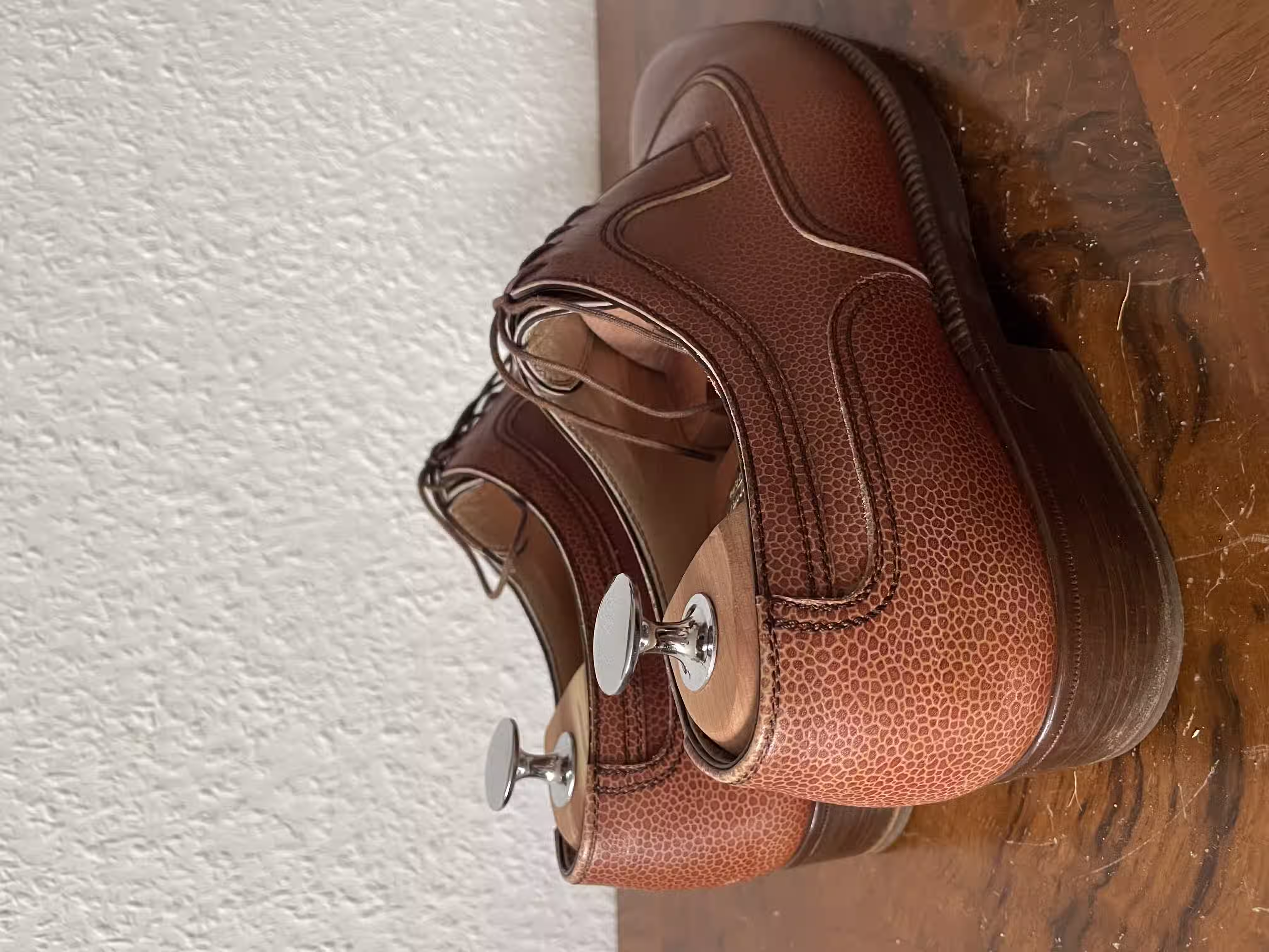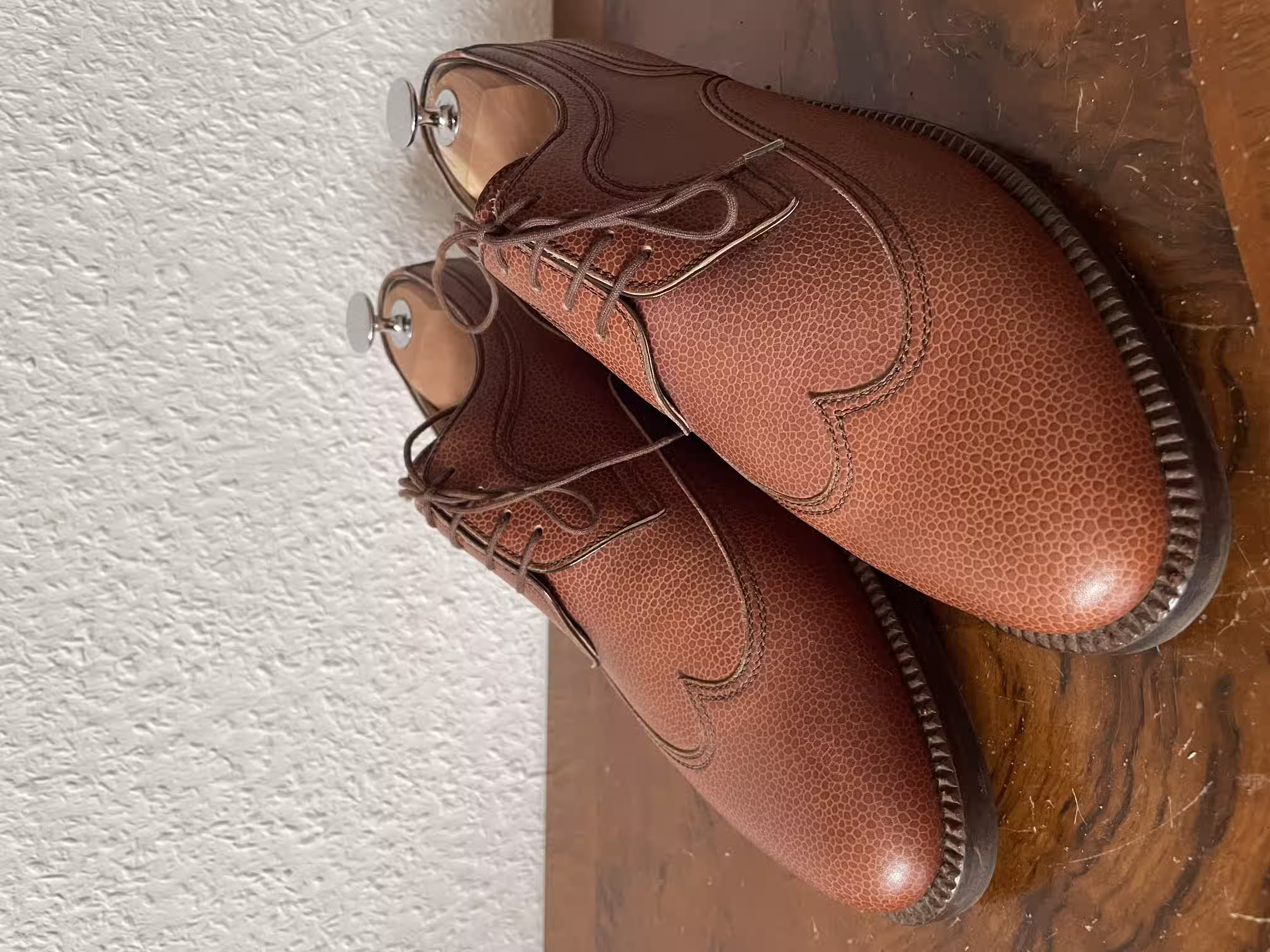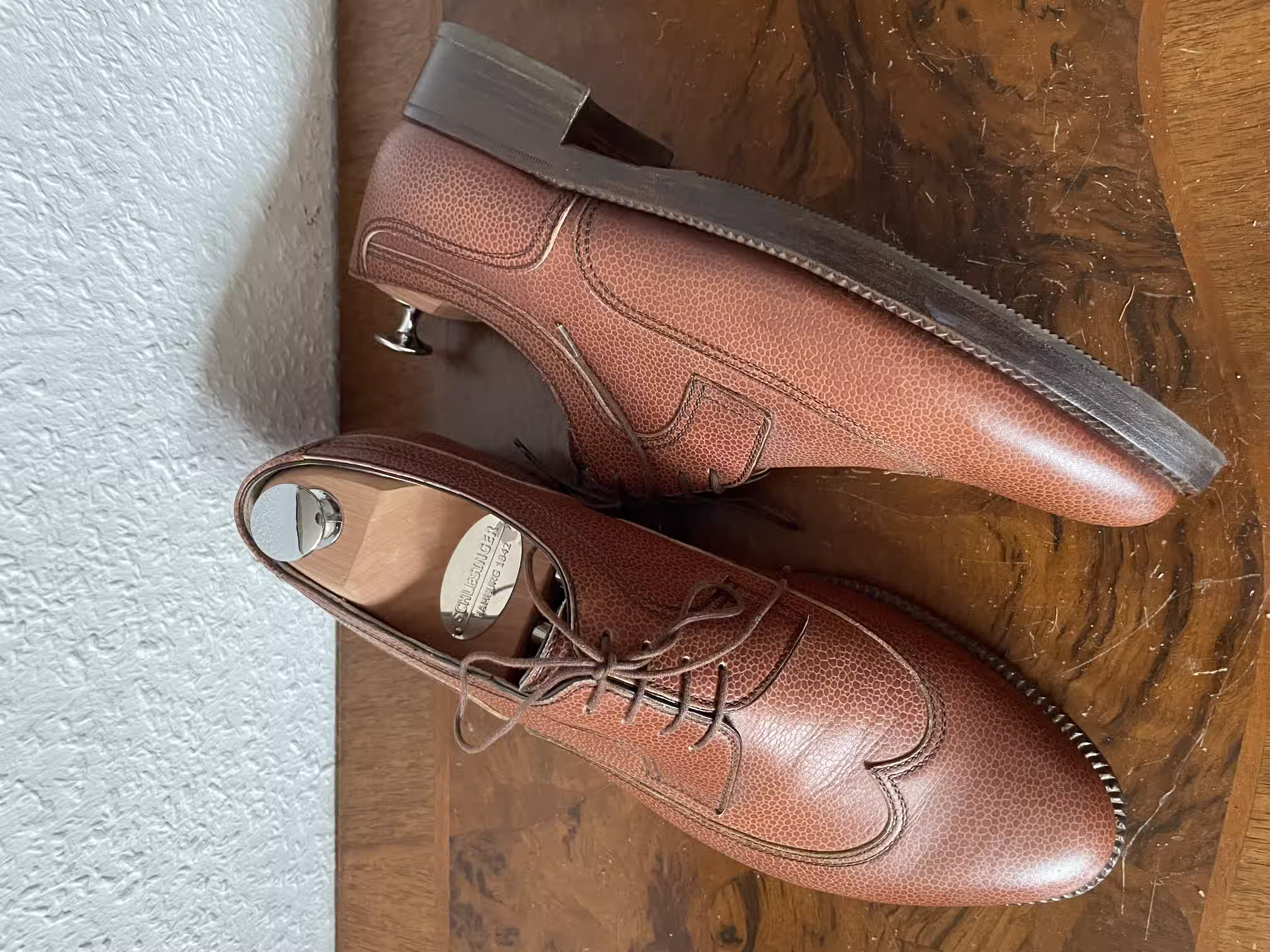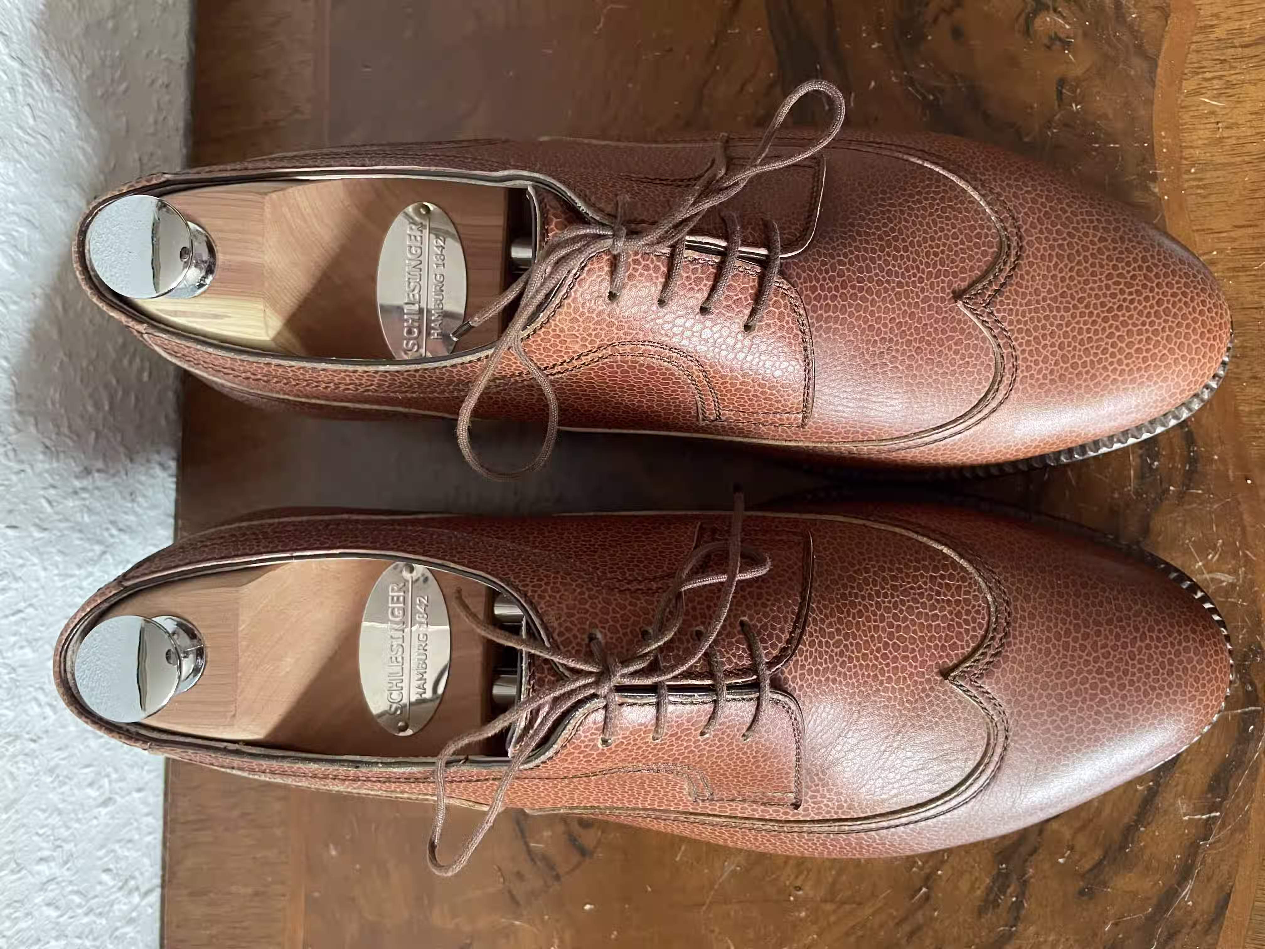 Here we have what is known as an Austerity Brogue, in which the line of the wing-cap edge is also more striking, because we have a double line there: two lines of stitching with a clearly visible distance between them. And in addition, there are no distracting perforation patterns here, which—besides the stitching—also lets the embossed leather in the light brown show to better effect. For me, this is a very successful casual model that is refreshingly different from the more common full brogue.