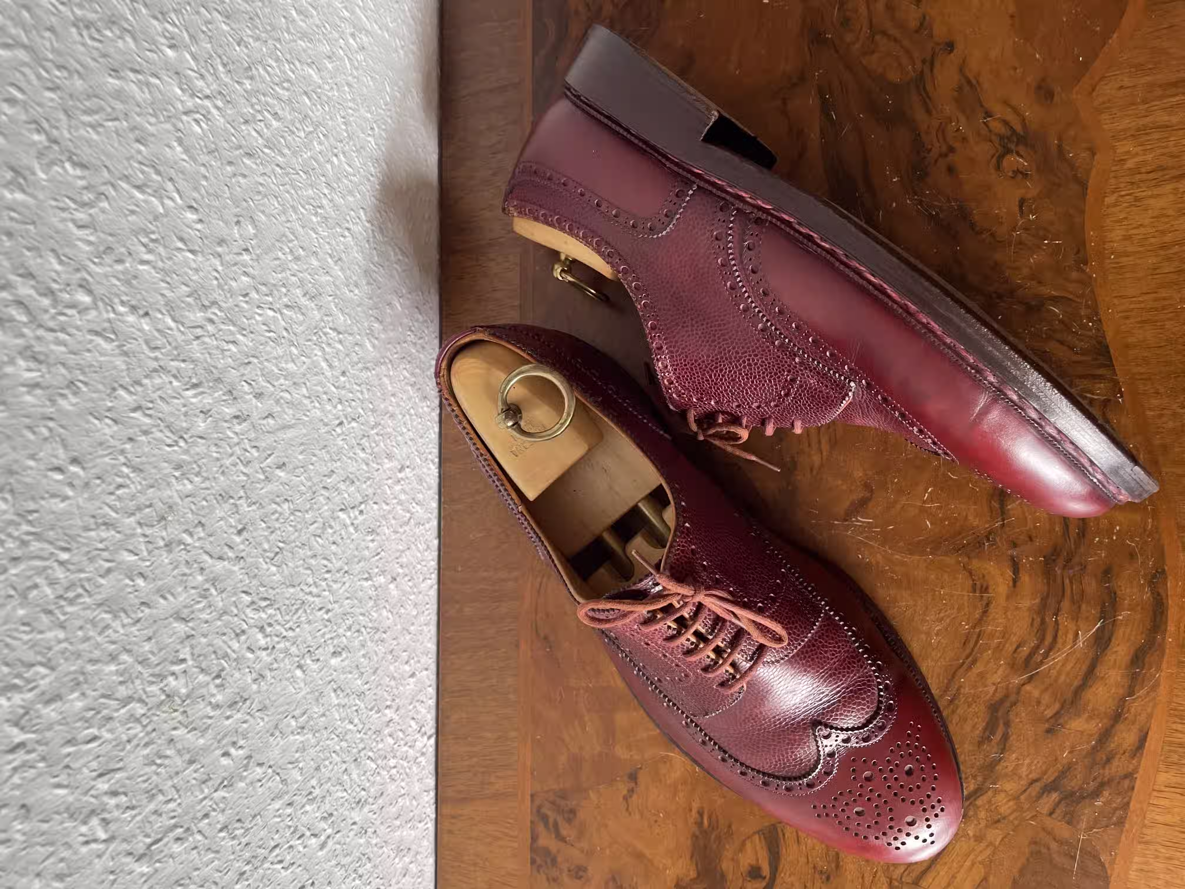 If there is a particularly popular shoe variant with a wing cap, it is probably the full brogue. Here the wing cap can be seen in a particularly ornate form—with wingtip perforations and a medallion, both of which define the full brogue. If you are interested in the full brogue, you can find more information and impressions here: